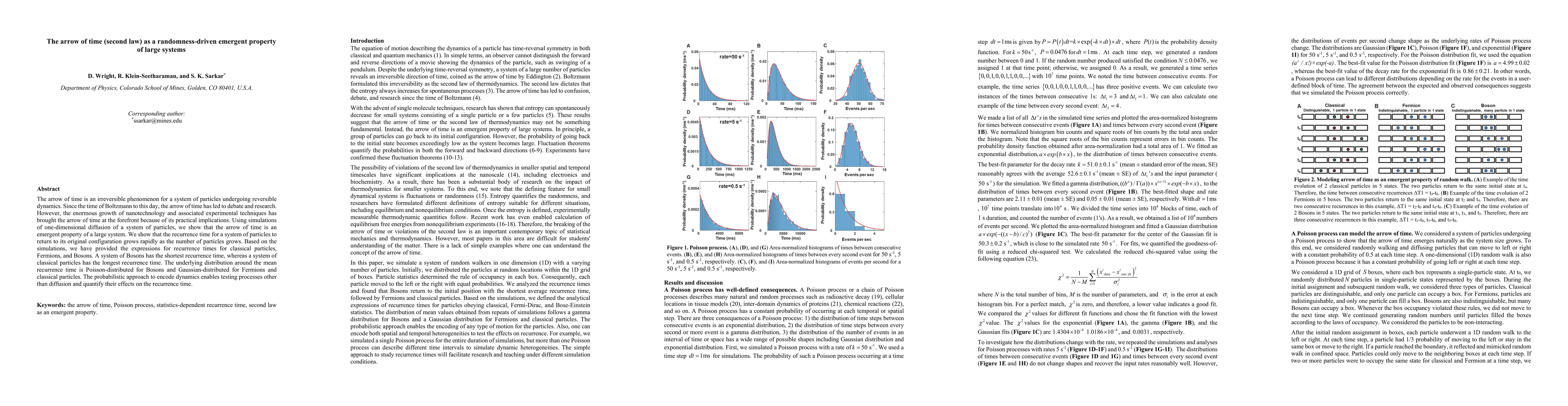 Research shows that the arrow of time, a fundamental concept in physics, is an emergent property of large systems through simulations of particle diffusion. The study provides expressions for recurrence times across different types of particles.