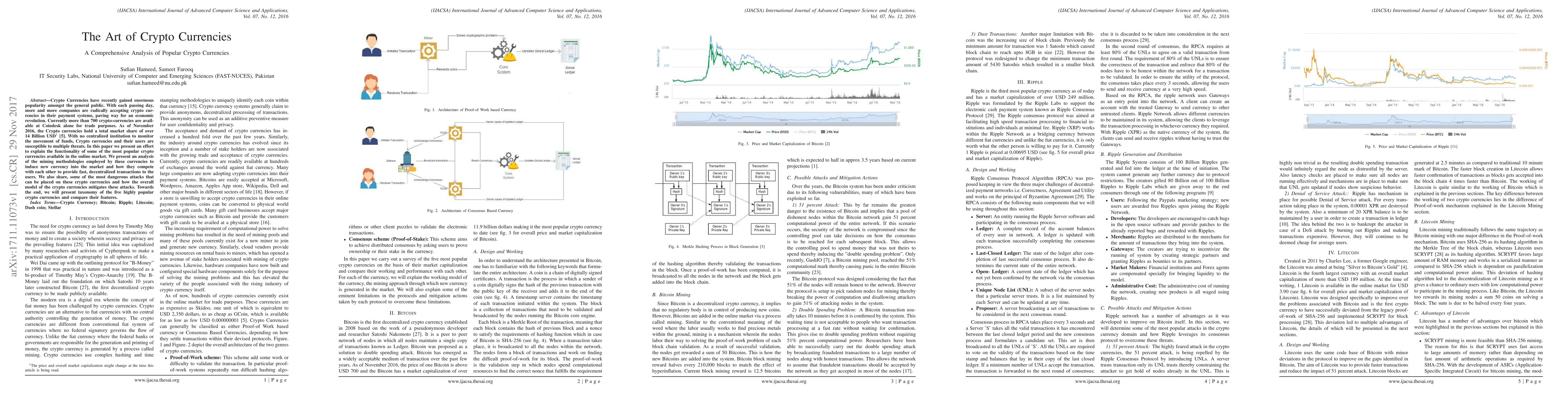 Crypto Currencies have recently gained enormous popularity amongst the general public. With each passing day, more and more companies are radically accepting crypto cur-rencies in their payment systems, paving way for an economic revolution. Currently more than 700 crypto-currencies are avail-able at Coindesk alone for trade purposes. As of November 2016, the Crypto currencies hold a total market share of over 14 Billion USD1 [5]. With no centralized institution to monitor the movement of funds, Crypto currencies and their users are susceptible to multiple threats. In this paper we present an effort to explain the functionality of some of the most popular crypto currencies available in the online market. We present an analysis of the mining methodologies employed by these currencies to induce new currency into the market and how they compete with each other to provide fast, decentralized transactions to the users. We also share, some of the most dangerous attacks that can be placed on these crypto currencies and how the overall model of the crypto currencies mitigates these attacks. Towards the end, we will present taxonomy of the five highly popular crypto currencies and compare their features.