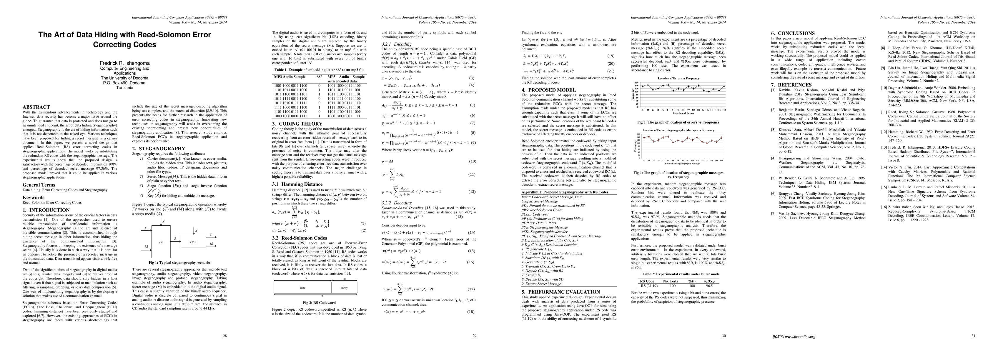 This paper introduces a novel steganographic technique using Reed-Solomon error correcting codes to hide secret messages within a carrier document, achieving 100% decoded information and 97.36% decoded secret message accuracy, demonstrating its potential for various applications.