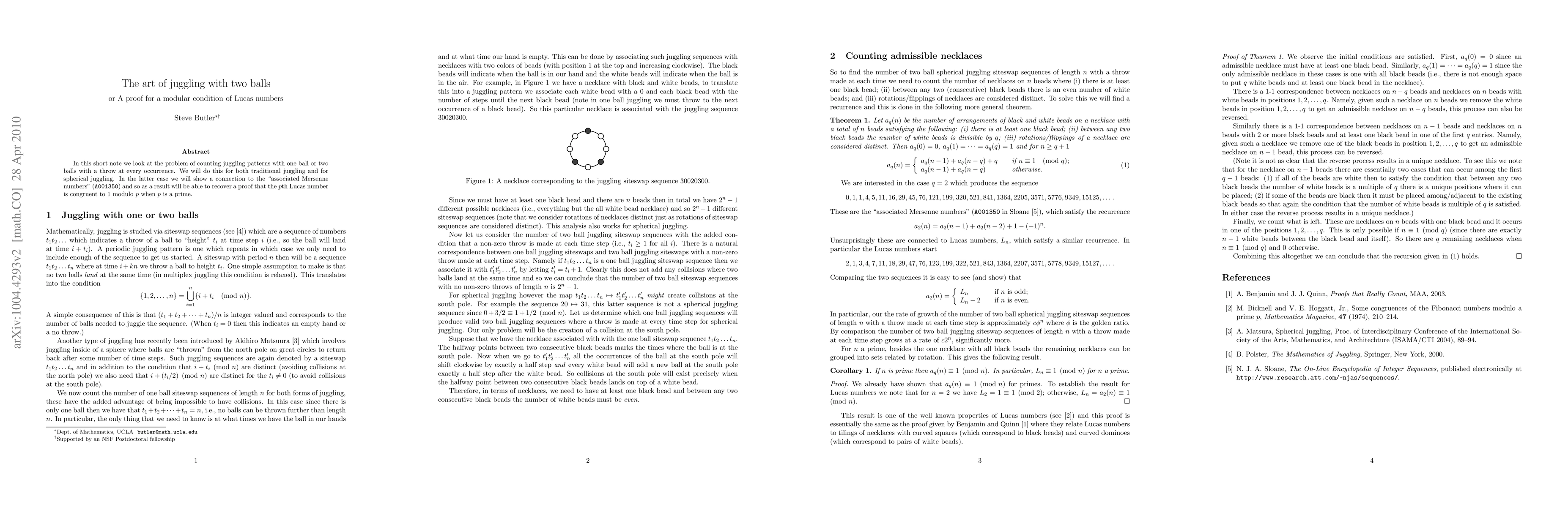 Summary: This paper explores juggling patterns with one or two balls and establishes a connection to Mersenne numbers, ultimately proving that the $p$th Lucas number is congruent to 1 modulo $p$ when $p$ is prime.