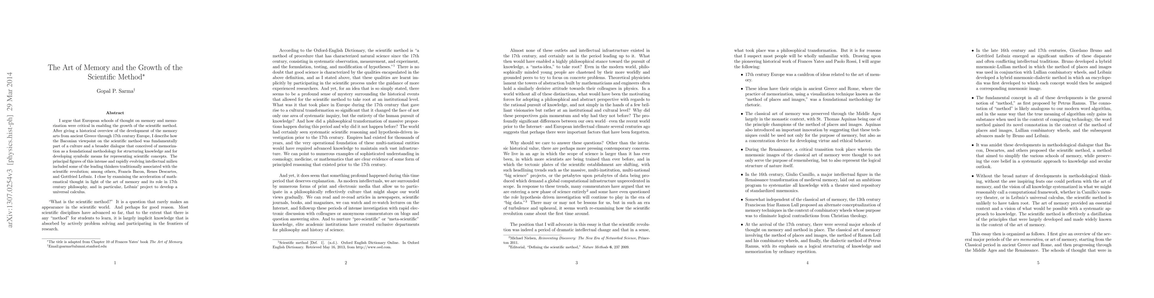I argue that European schools of thought on memory and memorization were critical in enabling the growth of the scientific method. After giving a historical overview of the development of the memory arts from ancient Greece through 17th century Europe, I describe how the Baconian viewpoint on the scientific method was fundamentally part of a culture and a broader dialogue that conceived of memorization as a foundational methodology for structuring knowledge and for developing symbolic means for representing scientific concepts. The principal figures of this intense and rapidly evolving intellectual milieu included some of the leading thinkers traditionally associated with the scientific revolution; among others, Francis Bacon, Renes Descartes, and Gottfried Leibniz. I close by examining the acceleration of mathematical thought in light of the art of memory and its role in 17th century philosophy, and in particular, Leibniz' project to develop a universal calculus.