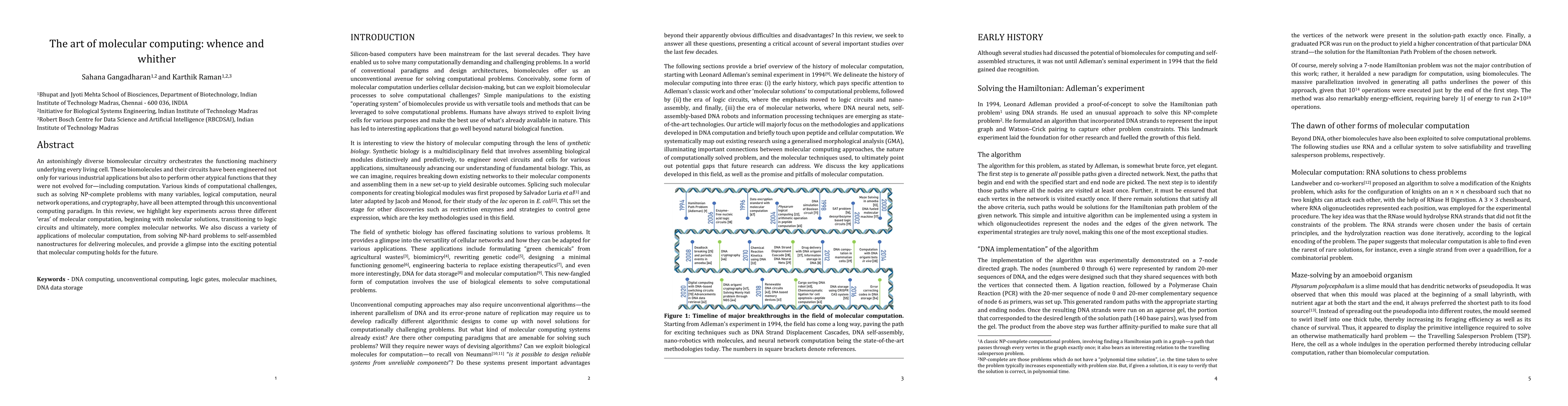 This paper reviews advances in molecular computing, showcasing how biomolecules can perform complex computations like solving NP-complete problems and cryptography, with potential applications in industries beyond traditional computing.