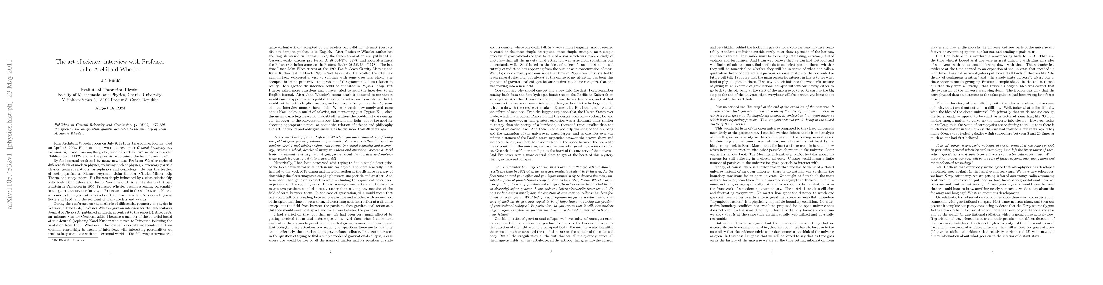 This paper presents an interview from 1976 with renowned physicist Professor John Archibald Wheeler, originally published in the Czechoslovak Journal of Physics A. The interview, reflecting Wheeler's views on the intersection of science, philosophy, and art, was republished in a special issue of "General Relativity and Gravitation" in memory of Wheeler.
