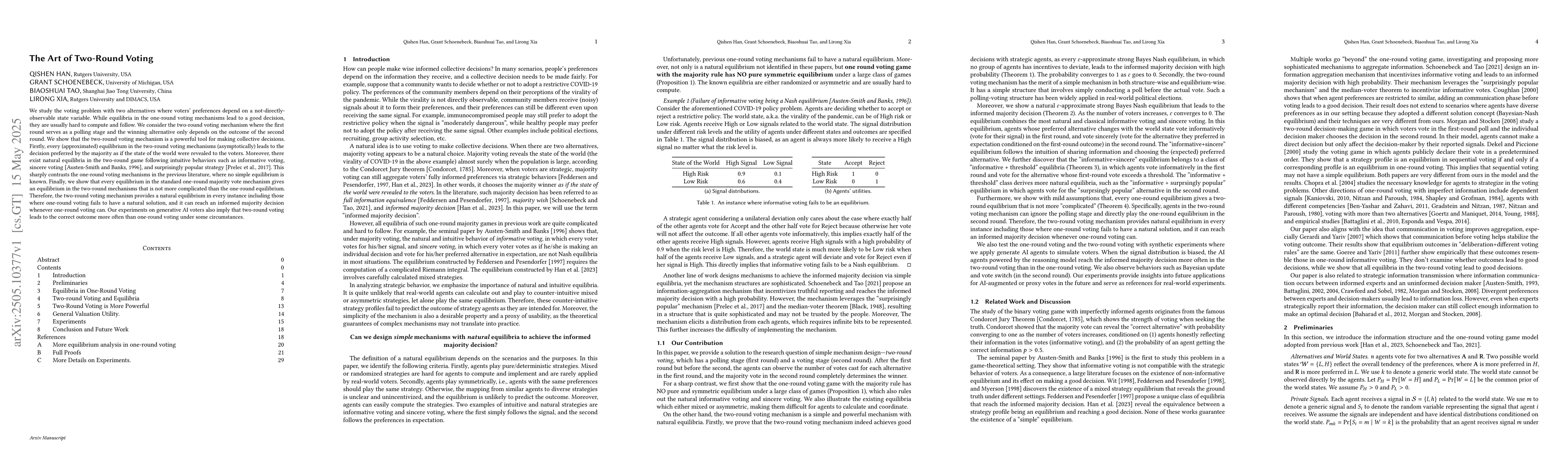 Unlike previous literature that struggles with simple equilibria in one-round voting, this research introduces a two-round mechanism with intuitive, natural equilibria that often align with majority preference.