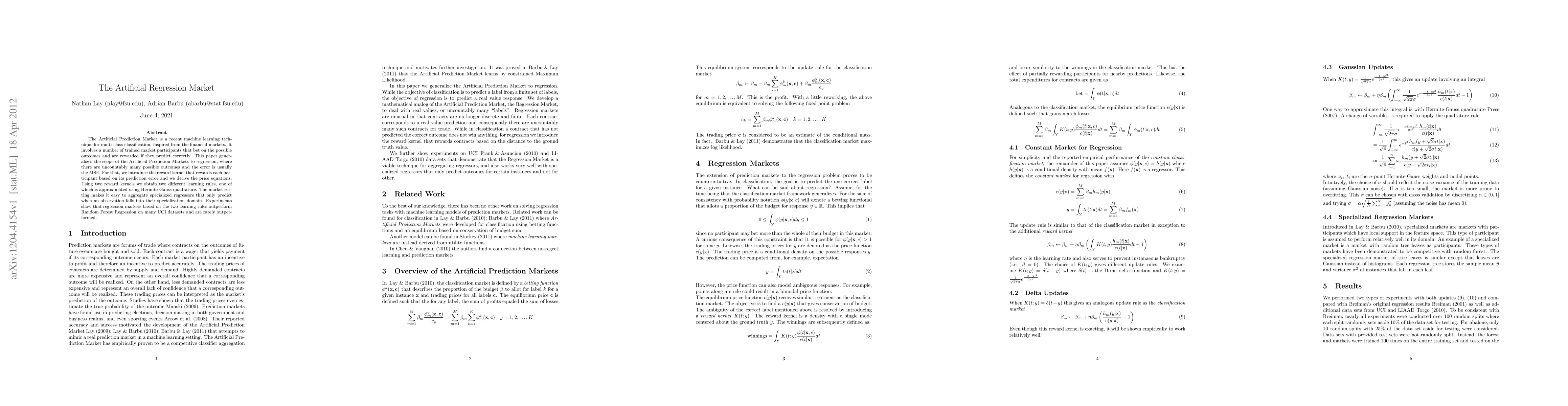 The Artificial Prediction Market is a recent machine learning technique for multi-class classification, inspired from the financial markets. It involves a number of trained market participants that bet on the possible outcomes and are rewarded if they predict correctly. This paper generalizes the scope of the Artificial Prediction Markets to regression, where there are uncountably many possible outcomes and the error is usually the MSE. For that, we introduce the reward kernel that rewards each participant based on its prediction error and we derive the price equations. Using two reward kernels we obtain two different learning rules, one of which is approximated using Hermite-Gauss quadrature. The market setting makes it easy to aggregate specialized regressors that only predict when an observation falls into their specialization domain. Experiments show that regression markets based on the two learning rules outperform Random Forest Regression on many UCI datasets and are rarely outperformed.