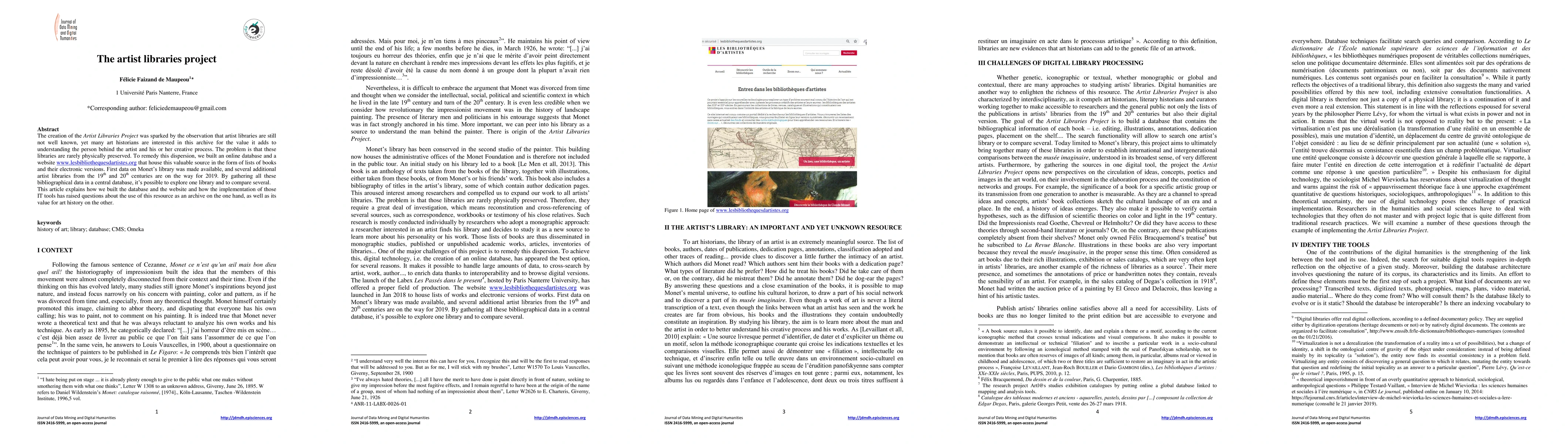 The creation of the Artist Libraries Project was sparked by the observation that artist libraries are still not well known, yet many art historians are interested in this archive for the value it adds to understanding the person behind the artist and his or her creative process. The problem is that these libraries are rarely physically preserved. To remedy this dispersion, we built an online database and a website www.lesbibliothequesdartistes.org that house this valuable source in the form of lists of books and their electronic versions. First data on Monet's library was made available, and several additional artist libraries from the 19 th and 20 th centuries are on the way for 2019. By gathering all these bibliographical data in a central database, it's possible to explore one library and to compare several. This article explains how we built the database and the website and how the implementation of those IT tools has raised questions about the use of this resource as an archive on the one hand, as well as its value for art history on the other.