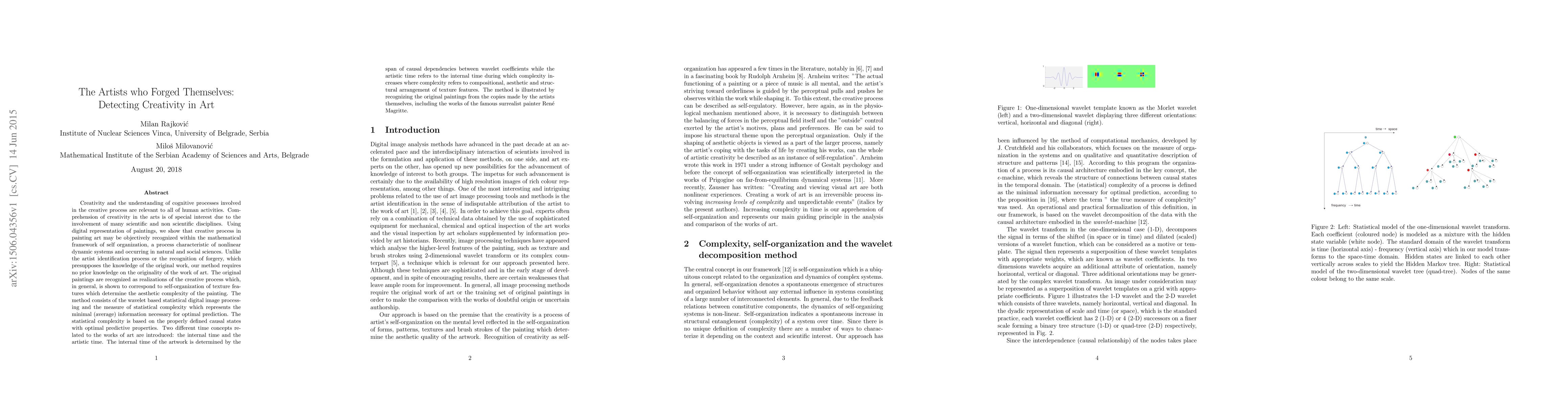 Creativity and the understanding of cognitive processes involved in the creative process are relevant to all of human activities. Comprehension of creativity in the arts is of special interest due to the involvement of many scientific and non scientific disciplines. Using digital representation of paintings, we show that creative process in painting art may be objectively recognized within the mathematical framework of self organization, a process characteristic of nonlinear dynamic systems and occurring in natural and social sciences. Unlike the artist identification process or the recognition of forgery, which presupposes the knowledge of the original work, our method requires no prior knowledge on the originality of the work of art. The original paintings are recognized as realizations of the creative process which, in general, is shown to correspond to self-organization of texture features which determine the aesthetic complexity of the painting. The method consists of the wavelet based statistical digital image processing and the measure of statistical complexity which represents the minimal (average) information necessary for optimal prediction. The statistical complexity is based on the properly defined causal states with optimal predictive properties. Two different time concepts related to the works of art are introduced: the internal time and the artistic time. The internal time of the artwork is determined by the span of causal dependencies between wavelet coefficients while the artistic time refers to the internal time during which complexity increases where complexity refers to compositional, aesthetic and structural arrangement of texture features. The method is illustrated by recognizing the original paintings from the copies made by the artists themselves, including the works of the famous surrealist painter Ren\'{e} Magritte.