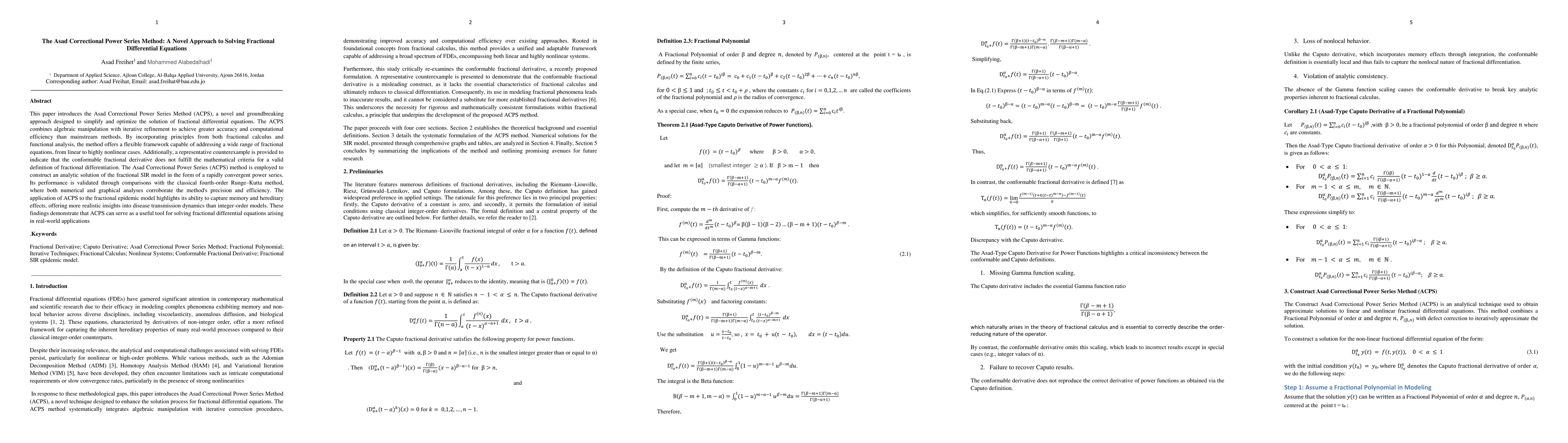 The paper introduces the Asad Correctional Power Series Method (ACPS), combining algebraic manipulation with iterative refinement to solve fractional differential equations. It also analyzes the conformable fractional derivative's validity through counterexamples and applies ACPS to the fractional SIR model.