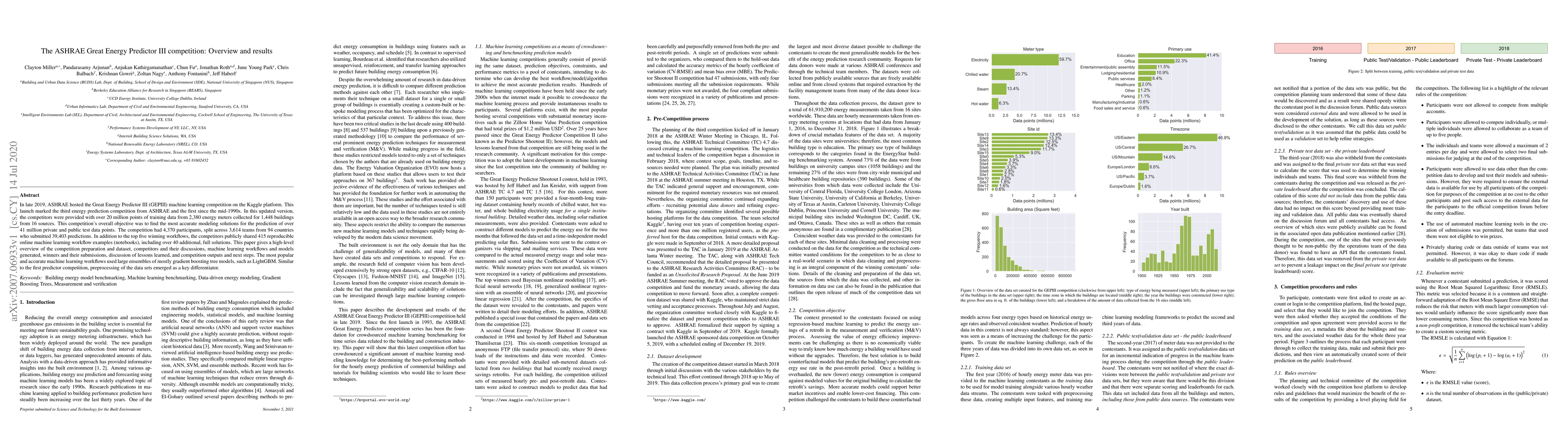 The ASHRAE Great Energy Predictor III competition involved 4,370 participants from 94 countries competing to predict energy consumption using over 20 million training data points. The winning workflows predominantly utilized large ensembles of gradient boosting tree models.