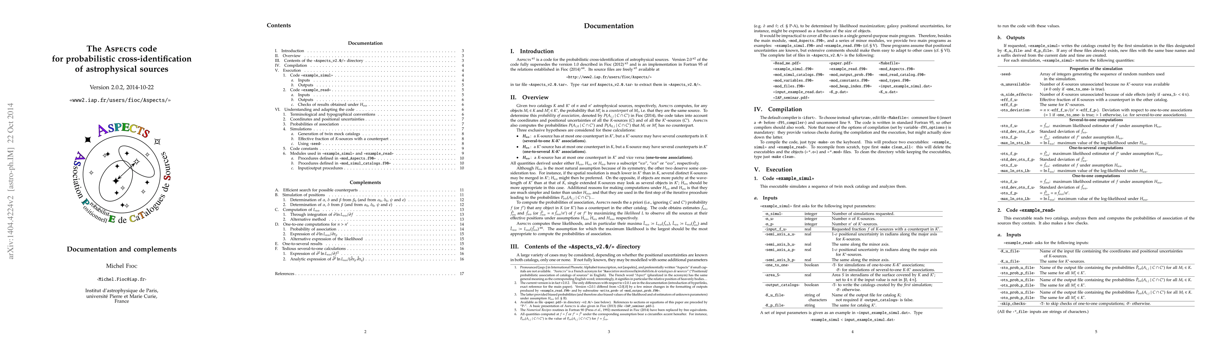 Aspects ([asp{\epsilon}], "ASsociation PositionnellE/ProbabilistE de CaTalogues de Sources" in French) is a Fortran 95 code for the cross-identification of astrophysical sources. Its source files are freely available. Given the coordinates and positional uncertainties of all the sources in two catalogs K and K', Aspects computes the probability that an object in K and one in K' are the same or that they have no counterpart. Three exclusive assumptions are considered: (1) Several-to-one associations: a K-source has at most one counterpart in K', but a K'-source may have several counterparts in K; (2) One-to-several associations: the same with K and K' swapped; (3) One-to-one associations: a K-source has at most one counterpart in K' and vice versa. To compute the probabilities of association, Aspects needs the a priori (i.e. ignoring positions) probability that an object has a counterpart. The code obtains estimates of this quantity by maximizing the likelihood to observe all the sources at their effective positions under each assumption. The likelihood may also be used to determine the most appropriate model, given the data, or to estimate the typical positional uncertainty if unknown.