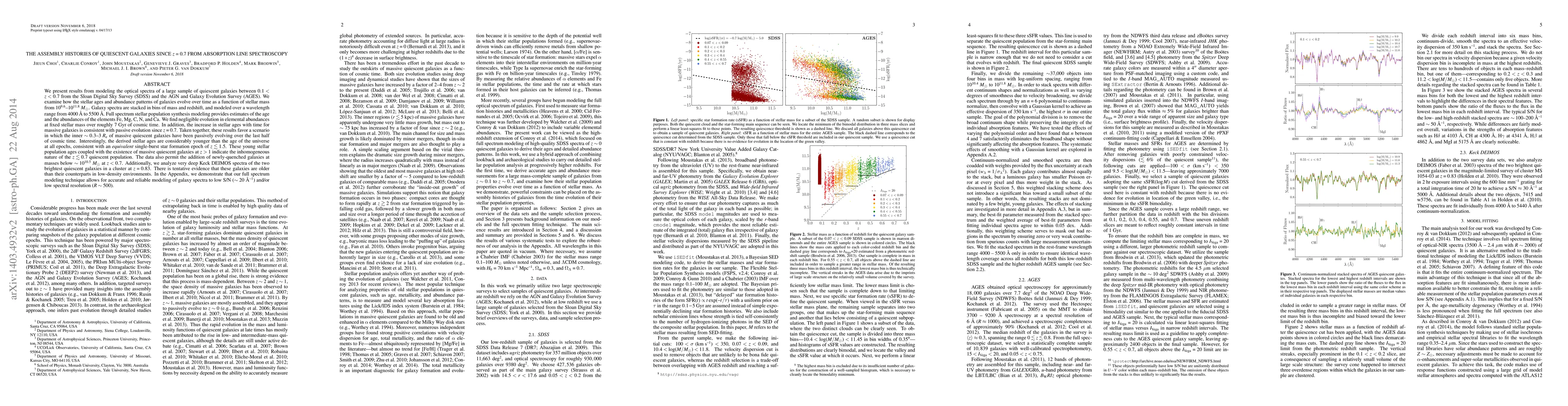 This paper models the optical spectra of quiescent galaxies from SDSS and AGES to trace their assembly histories since z=0.7. It finds negligible evolution in elemental abundances over 7 Gyr, suggesting passive evolution for massive galaxies, while younger stellar ages imply a recent star formation burst.