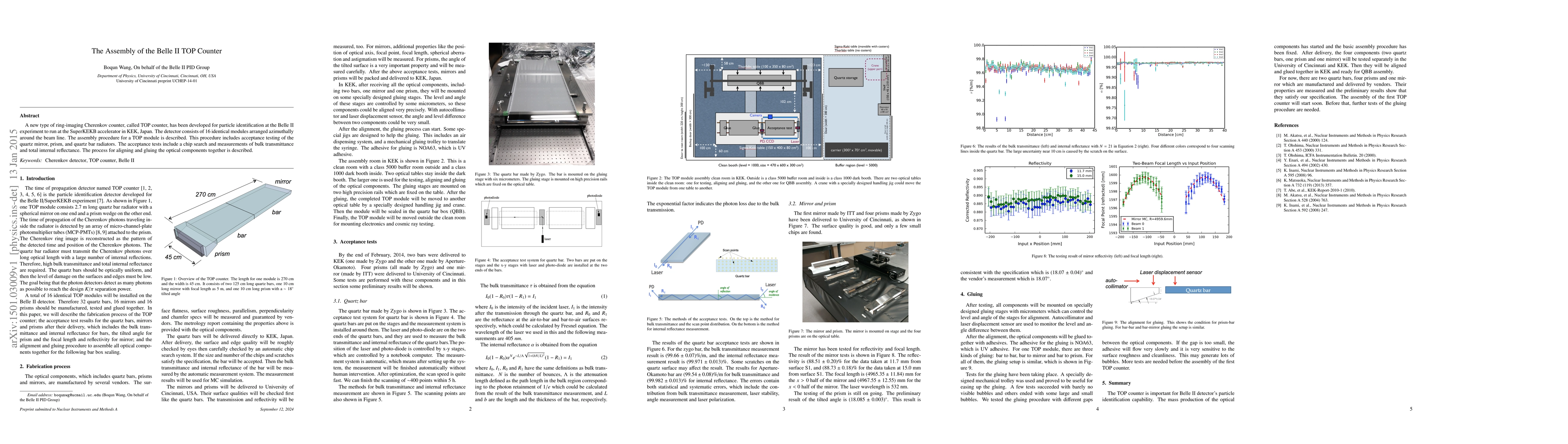 The Belle II TOP counter, a ring-imaging Cherenkov device for particle identification, comprises 16 azimuthal modules. The assembly process includes rigorous acceptance testing of quartz components and precise alignment and gluing of optical parts.