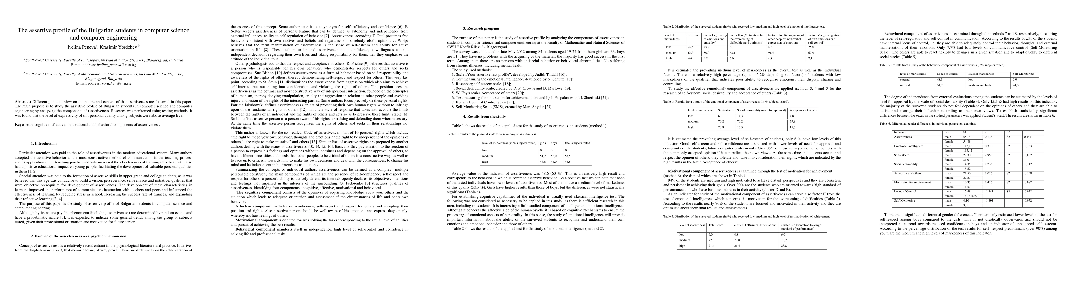 Different points of view on the nature and content of the assertiveness are followed in this paper. The main purpose is to study the assertive profile of Bulgarian students in computer science and computer engineering by analyzing the components of assertiveness. Research was performed using testing methods. It was found that the level of expressivity of this personal quality among subjects were above-average level.