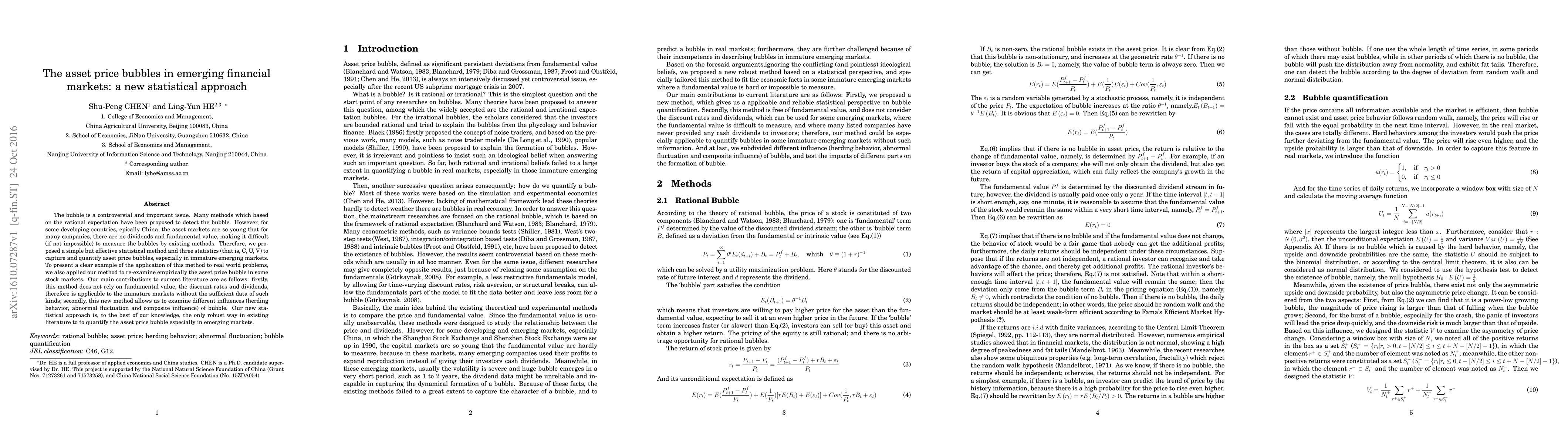 This paper proposes a new statistical method to detect and quantify asset price bubbles in emerging financial markets, particularly where traditional methods fail due to lack of fundamental data. The method introduces three statistics (C, U, V) and is applicable to young markets like China, allowing analysis of herding behavior, abnormal fluctuations, and composite influences.