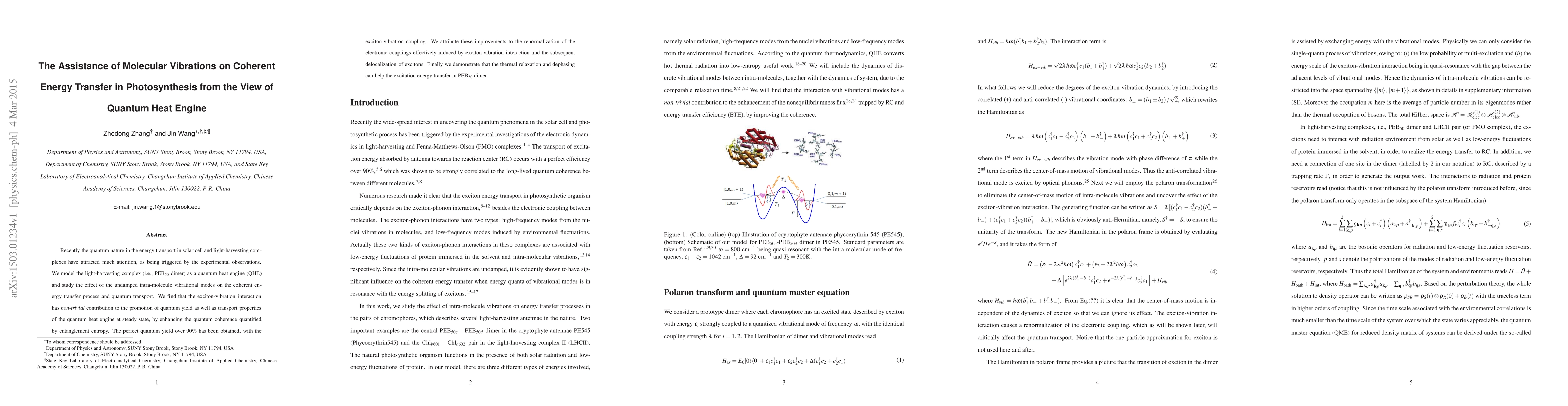 This paper models the light-harvesting complex as a quantum heat engine to investigate how molecular vibrations enhance coherent energy transfer in photosynthesis. It finds that exciton-vibration interactions significantly improve quantum yield and coherence, achieving over 90% quantum yield, due to the renormalization of electronic couplings and exciton delocalization.
