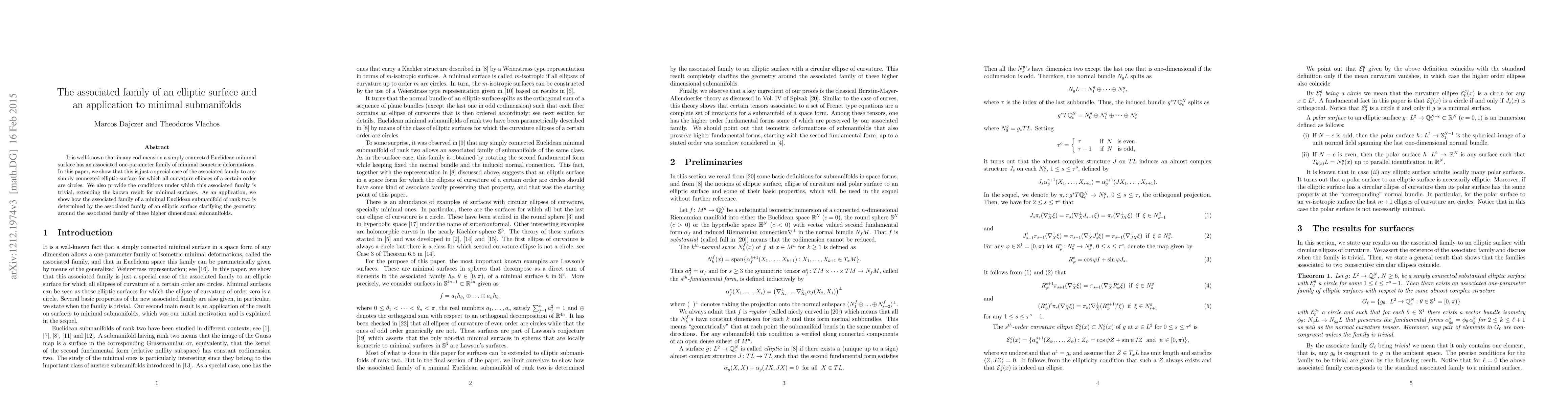 It is well-known that in any codimension a simply connected Euclidean minimal surface has an associated one-parameter family of minimal isometric deformations. In this paper, we show that this is just a special case of the associated family to any simply connected elliptic surface for which all curvature ellipses of a certain order are circles. We also provide the conditions under which this associated family is trivial, extending the known result for minimal surfaces. As an application, we show how the associated family of a minimal Euclidean submanifold of rank two is determined by the associated family of an elliptic surface clarifying the geometry around the associated family of these higher dimensional submanifolds.
