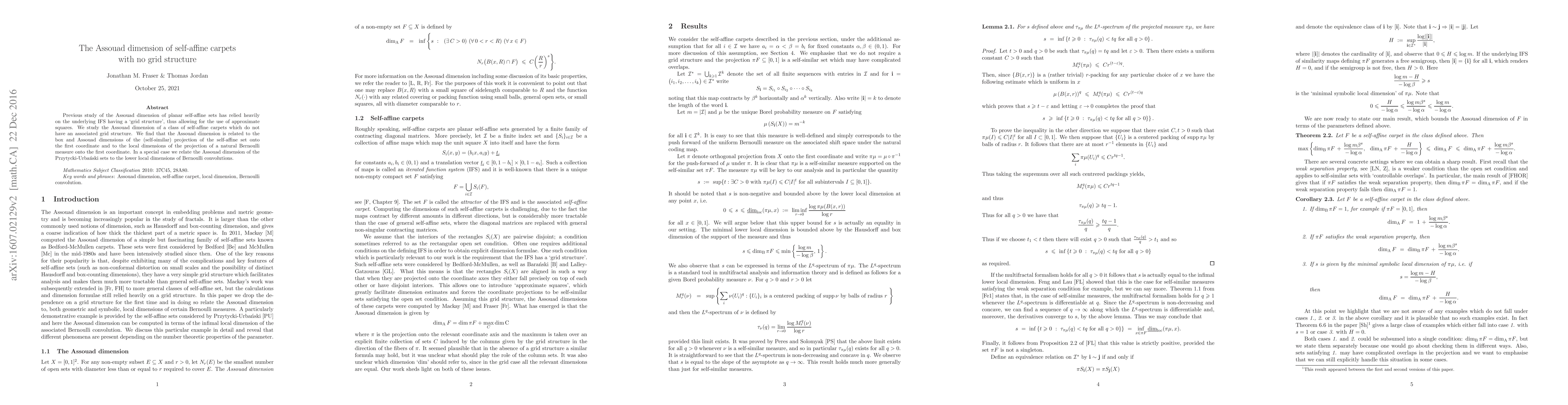 This paper investigates the Assouad dimension of self-affine carpets lacking a grid structure, finding it linked to the box and Assouad dimensions of their self-similar projections and the local dimensions of Bernoulli measure projections. In a specific case, it relates the Assouad dimension of Przytycki-Urba\'nski sets to lower local dimensions of Bernoulli convolutions.