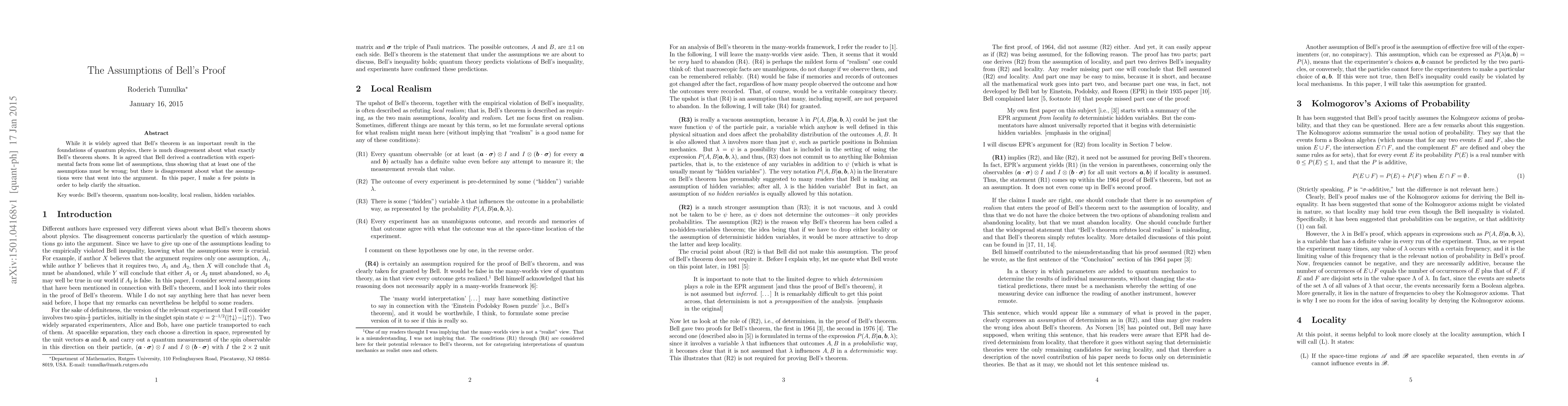 Summary: This paper aims to clarify the assumptions underlying Bell's theorem, which demonstrates a contradiction between quantum mechanics and classical physics, and seeks to resolve the ongoing debate about which specific assumptions are integral to the argument.