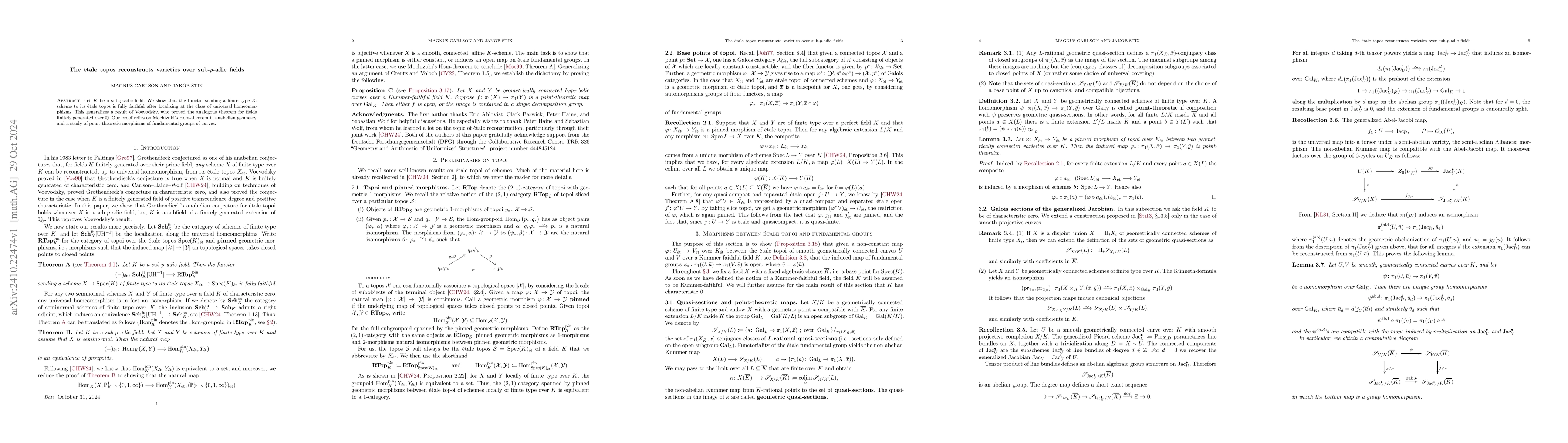 The paper demonstrates that the étale topos functor reconstructs $K$-varieties over sub-$p$-adic fields after localizing at universal homeomorphisms, generalizing Voevodsky's theorem for fields over $\mathbb{Q}$. The proof uses Mochizuki's Hom-theorem and studies point-theoretic morphisms of fundamental groups of curves.