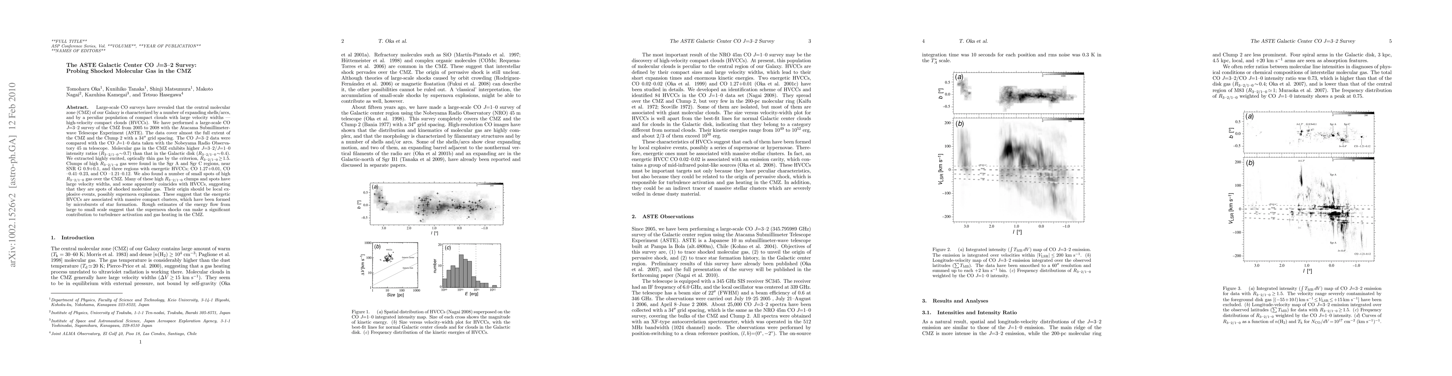 Large-scale CO surveys have revealed that the central molecular zone (CMZ) of our Galaxy is characterized by a number of expanding shells/arcs, and by a peculiar population of compact clouds with large velocity widths -- high-velocity compact clouds (HVCCs). We have performed a large-scale CO J=3-2 survey of the CMZ from 2005 to 2008 with the Atacama Submillimeter-wave Telescope Experiment (ASTE). The data cover almost the full extent of the CMZ and the Clump 2 with a 34 arcsec grid spacing. The CO J=3-2 data were compared with the CO J=1--0 data taken with the Nobeyama Radio Observatory 45 m telescope. Molecular gas in the CMZ exhibits higher J=3-2/J=1-0 intensity ratios [R(3-2/1-0)=0.7] than that in the Galactic disk [R(3-2/1-0)=0.4]. We extracted highly excited, optically thin gas by the criterion, R(3-2/1-0)>=1.5. Clumps of high R(3-2/1-0) gas were found in the Sgr A and Sgr C regions, near SNR G 0.9+0.1, and three regions with energetic HVCCs; CO 1.27+0.01, CO -0.41-0.23, and CO -1.21-0.12. We also found a number of small spots of high R(3-2/1-0) gas over the CMZ. Many of these high R(3-2/1-0) clumps and spots have large velocity widths, and some apparently coincides with HVCCs, suggesting that they are spots of shocked molecular gas. Their origin should be local explosive events, possibly supernova explosions. These suggest that the energetic HVCCs are associated with massive compact clusters, which have been formed by microbursts of star formation. Rough estimates of the energy flow from large to small scale suggest that the supernova shocks can make a significant contribution to turbulence activation and gas heating in the CMZ.