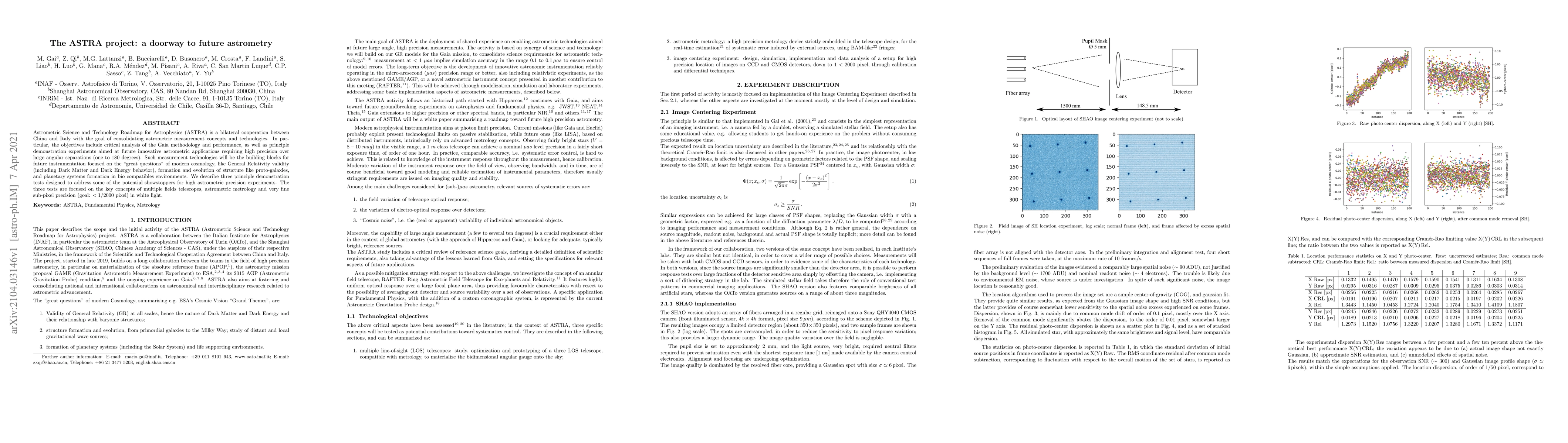 Astrometric Science and Technology Roadmap for Astrophysics (ASTRA) is a bilateral cooperation between China and Italy with the goal of consolidating astrometric measurement concepts and technologies. In particular, the objectives include critical analysis of the Gaia methodology and performance, as well as principle demonstration experiments aimed at future innovative astrometric applications requiring high precision over large angular separations (one to 180 degrees). Such measurement technologies will be the building blocks for future instrumentation focused on the "great questions" of modern cosmology, like General Relativity validity (including Dark Matter and Dark Energy behavior), formation and evolution of structure like proto-galaxies, and planetary systems formation in bio compatibles environments. We describe three principle demonstration tests designed to address some of the potential showstoppers for high astrometric precision experiments. The three tests are focused on the key concepts of multiple fields telescopes, astrometric metrology and very fine sub-pixel precision (goal: <1/2000 pixel) in white light.