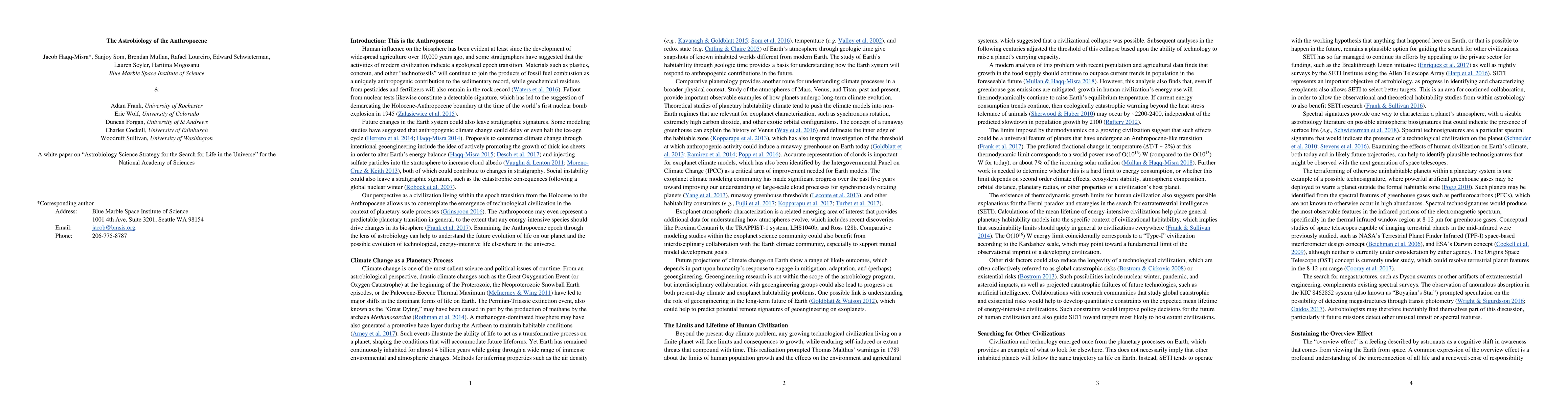 This paper explores the concept of the Anthropocene as a potential geological epoch marked by human impact on the biosphere, emphasizing the role of astrobiology in understanding climate change and the limits of energy-intensive civilizations. It advocates for continued exploration missions to better comprehend life's future on Earth and the potential for technological life elsewhere.