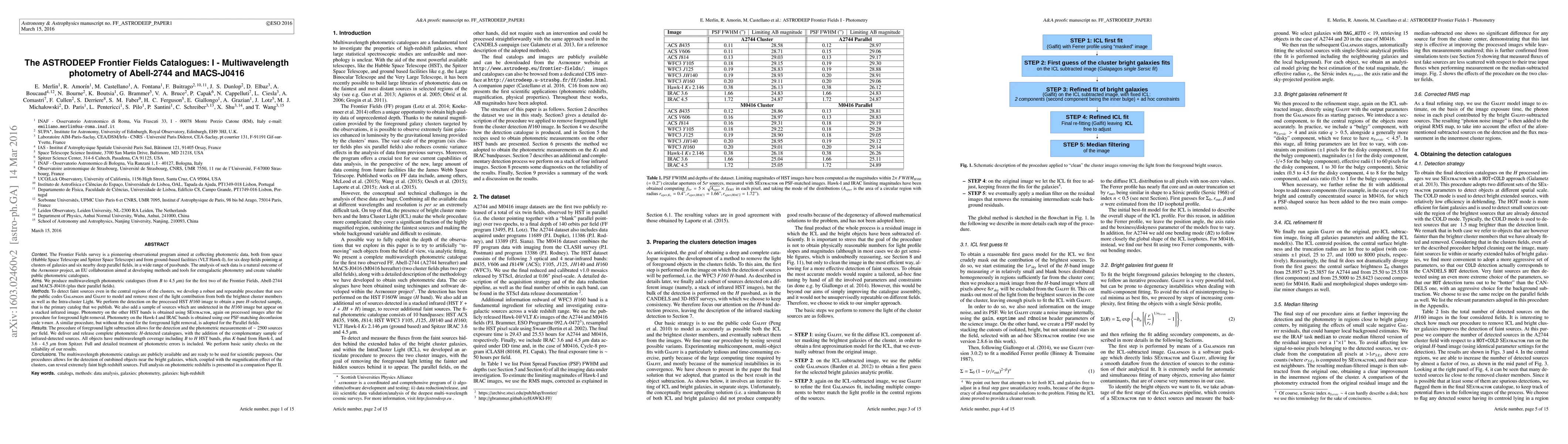 This paper presents multiwavelength photometric catalogues for the Frontier Fields clusters Abell-2744 and MACS-J0416, developed using HST, Spitzer, and Hawk-I K-band data. The authors employ advanced modeling techniques to isolate faint sources, enabling the detection of over 2500 objects per field, and release comprehensive catalogues for scientific use.