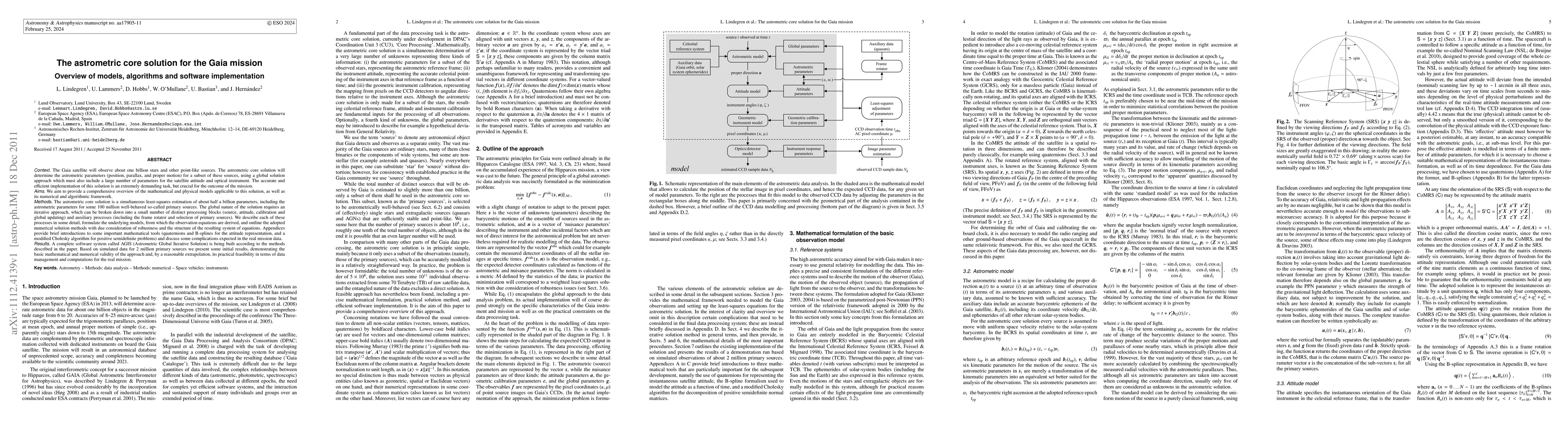 This paper provides a detailed overview of the astrometric core solution for the Gaia mission, focusing on the mathematical and algorithmic models used to determine the astrometric parameters for a subset of observed stars. It describes the global least-squares estimation approach, including the iterative processing blocks and auxiliary processes, and discusses the numerical methods employed to ensure robustness and accuracy.