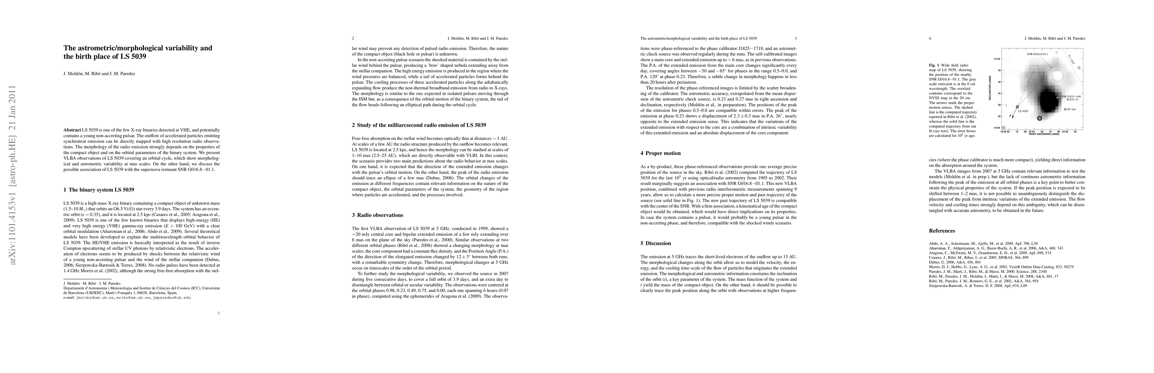 LS 5039 is one of the few X-ray binaries detected at VHE, and potentially contains a young non-accreting pulsar. The outflow of accelerated particles emitting synchrotron emission can be directly mapped with high resolution radio observations. The morphology of the radio emission strongly depends on the properties of the compact object and on the orbital parameters of the binary system. We present VLBA observations of LS 5039 covering an orbital cycle, which show morphological and astrometric variability at mas scales. On the other hand, we discuss the possible association of LS 5039 with the supernova remnant SNR G016.8-01.1.