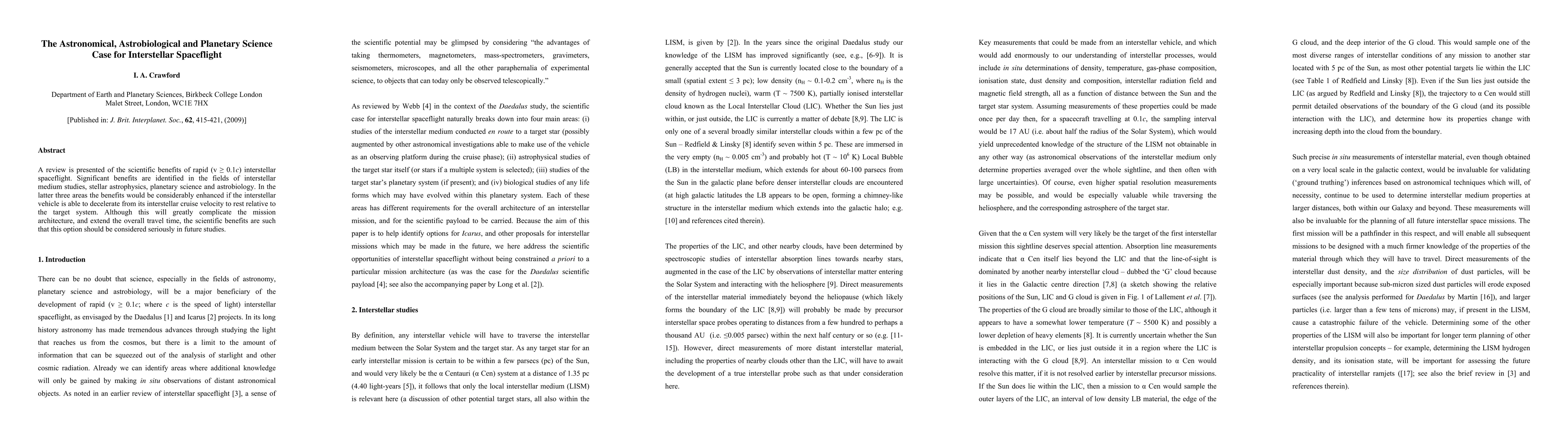 A review is presented of the scientific benefits of rapid (v >= 0.1c) interstellar spaceflight. Significant benefits are identified in the fields of interstellar medium studies, stellar astrophysics, planetary science and astrobiology. In the latter three areas the benefits would be considerably enhanced if the interstellar vehicle is able to decelerate from its interstellar cruise velocity to rest relative to the target system. Although this will greatly complicate the mission architecture, and extend the overall travel time, the scientific benefits are such that this option should be considered seriously in future studies.
