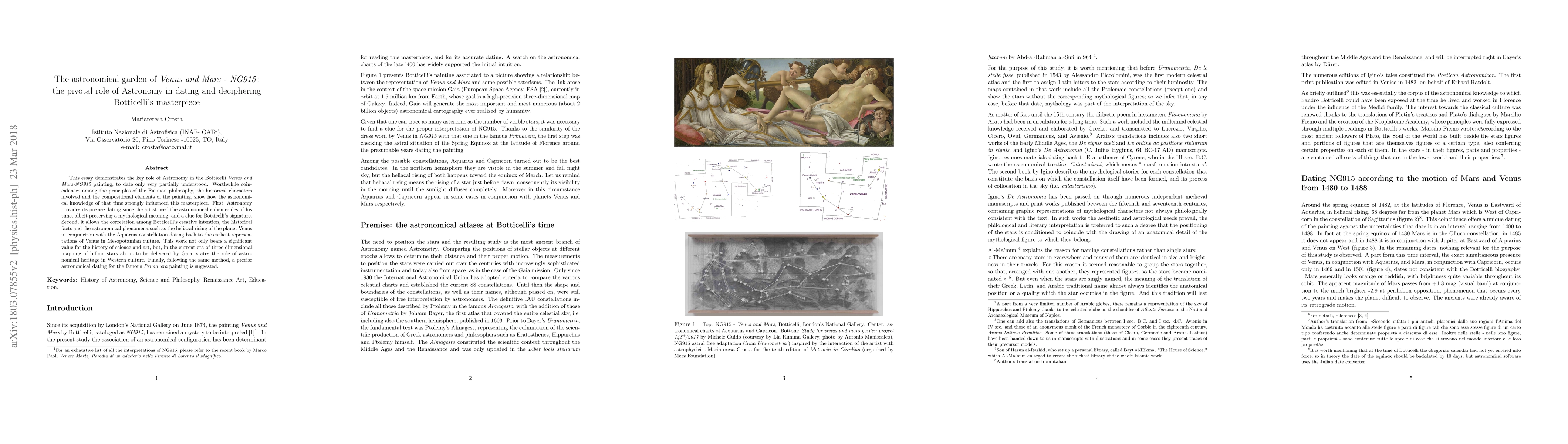 This essay demonstrates the key role of Astronomy in Botticelli's "Venus and Mars-NG915" painting, to date only very partially understood. Worthwhile coincidences among the principles of the Ficinian philosophy, the historical characters involved and the compositional elements of the painting, show how the astronomical knowledge of that time strongly influenced this masterpiece. First, Astronomy provides its precise dating since the artist used the astronomical ephemerides of his time, albeit preserving a mythological meaning, and a clue for Botticelli's signature. Second, it allows the correlation among Botticelli's creative intention, the historical facts and the astronomical phenomena such as the heliacal rising of the planet Venus in conjunction with the Aquarius constellation dating back to the earliest representations of Venus in Mesopotamian culture. This work not only bears a significant value for the history of science and art, but, in the current era of three-dimensional mapping of billion stars about to be delivered by Gaia, states the role of astronomical heritage in Western culture. Finally, following the same method, a precise astronomical dating for the famous Primavera painting is suggested.