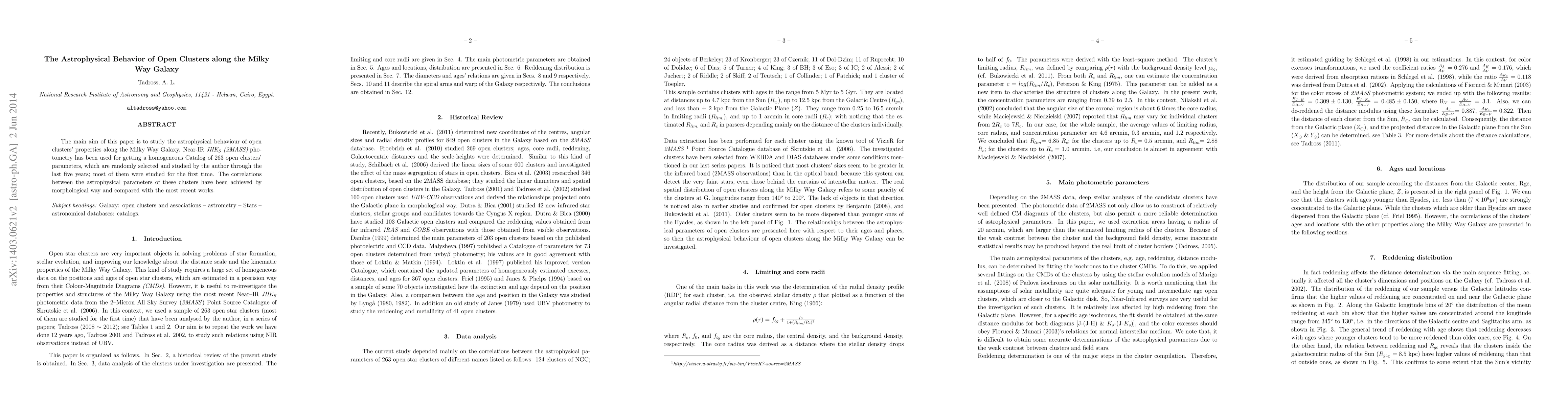 The main aim of this paper is to study the astrophysical behavior of open clusters' properties along the Milky Way Galaxy. Near-IR JHK (2MASS) photometry has been used for getting a homogeneous Catalog of 263 open clusters' parameters, which are studied for the first time by the author through the last five years. The correlations between the astrophysical parameters of these clusters have been achieved in morphological way and compared with the most recent works.