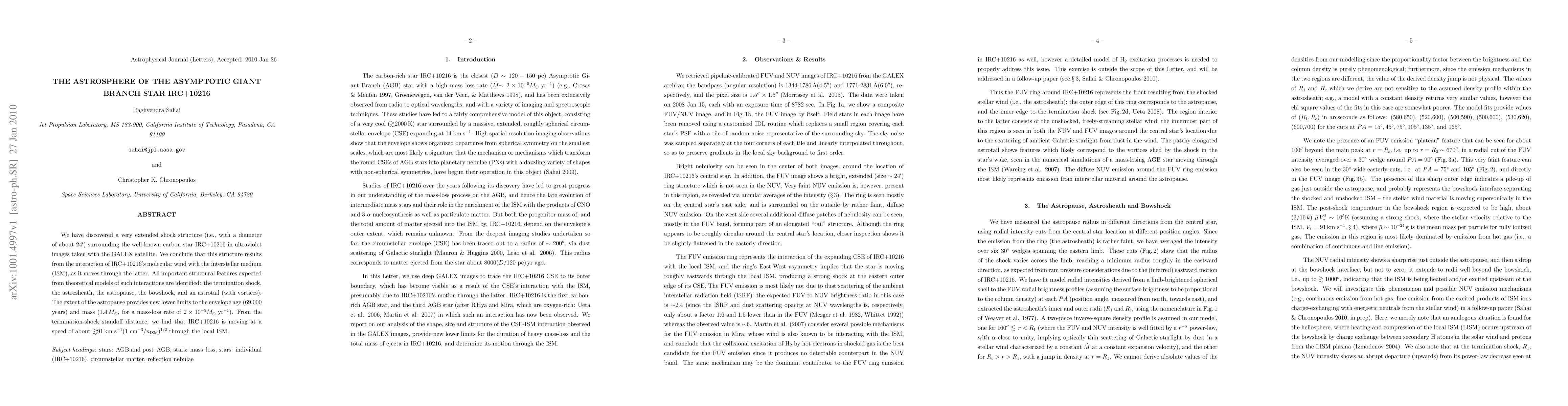 We have discovered a very extended shock structure (i.e., with a diameter of about 24 arcmin) surrounding the well-known carbon star IRC+10216 in ultraviolet images taken with the GALEX satellite. We conclude that this structure results from the interaction of IRC+10216's molecular wind with the interstellar medium (ISM), as it moves through the latter. All important structural features expected from theoretical models of such interactions are identified: the termination shock, the astrosheath, the astropause, the bowshock, and an astrotail (with vortices). The extent of the astropause provides new lower limits to the envelope age (69,000 years) and mass (1.4 solar masses, for a mass-loss rate of 2 x 10^(-5) solar masses/year). From the termination-shock standoff distance, we find that IRC+10216 is moving at a speed of about > 91 km/s [1 cm^(-3)/n_(ISM)]^1/2 through the local ISM.