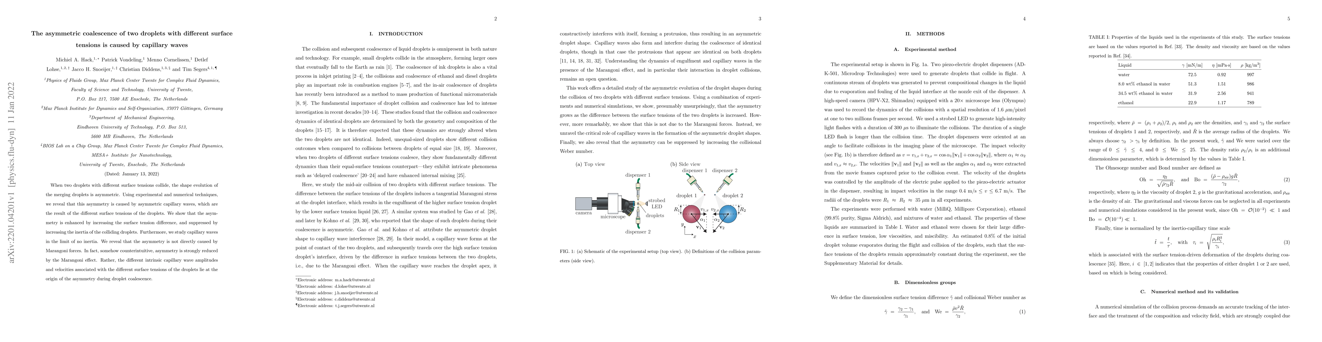 This study reveals that the asymmetric coalescence of droplets with differing surface tensions is driven by asymmetric capillary waves, rather than Marangoni forces. The asymmetry intensifies with greater surface tension differences and diminishes with increased droplet inertia.