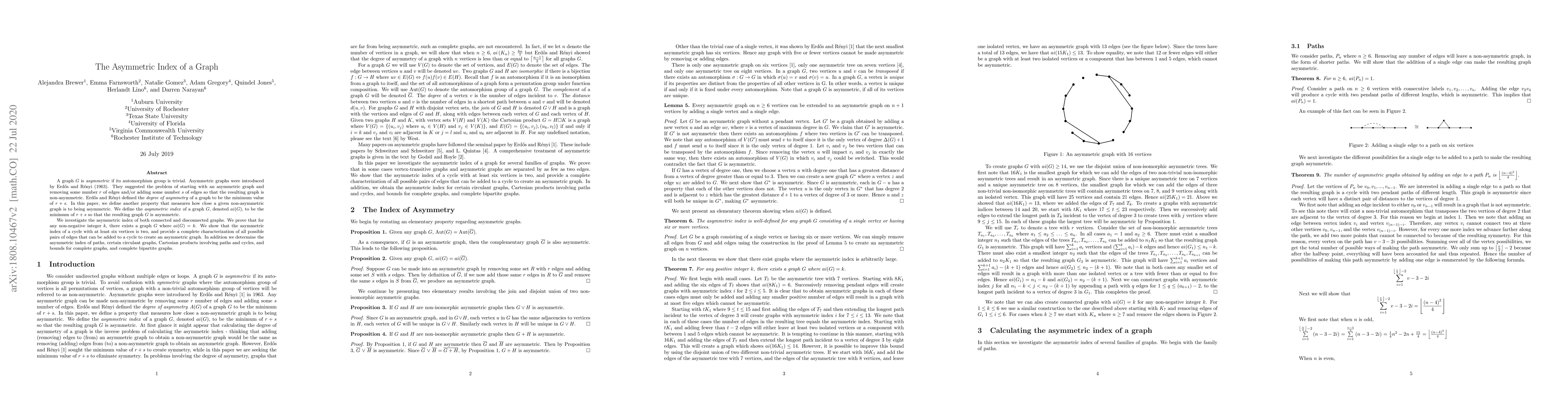 A graph $G$ is asymmetric if its automorphism group of vertices is trivial. Asymmetric graphs were introduced by Erd\H{o}s and R\'{e}nyi in 1963 where they measured the degree of asymmetry of an asymmetric graph. They proved that any asymmetric graph can be made non-asymmetric by removing some number $r$ of edges and/or adding adding some number $s$ of edges, and defined the degree of asymmetry of a graph to be the minimum value of $r+s$. In this paper, we define another property that how close a given non-asymmetric graph is to being asymmetric. We define the asymmetric index of a graph $G$, denoted $ai(G)$, to be the minimum of $r+s$ in order to change $G$ into an asymmetric graph.