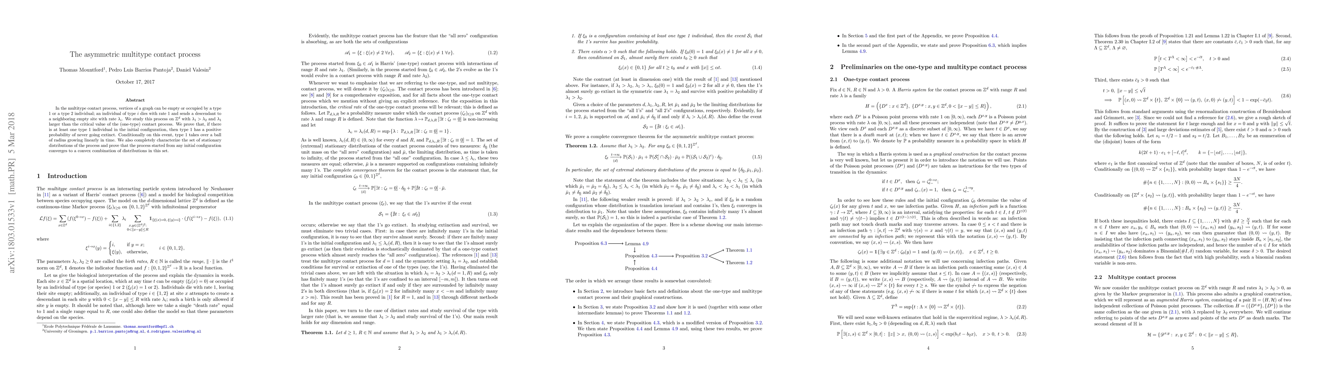 In the multitype contact process, vertices of a graph can be empty or occupied by a type 1 or a type 2 individual; an individual of type $i$ dies with rate 1 and sends a descendant to a neighboring empty site with rate $\lambda_i$. We study this process on $\Z^d$ with $\lambda_1 > \lambda_2$ and $\lambda_1$ larger than the critical value of the (one-type) contact process. We prove that, if there is at least one type 1 individual in the initial configuration, then type 1 has a positive probability of never going extinct. Conditionally on this event, type 1 takes over a ball of radius growing linearly in time. We also completely characterize the set of stationary distributions of the process and prove that the process started from any initial configuration converges to a convex combination of distributions in this set.