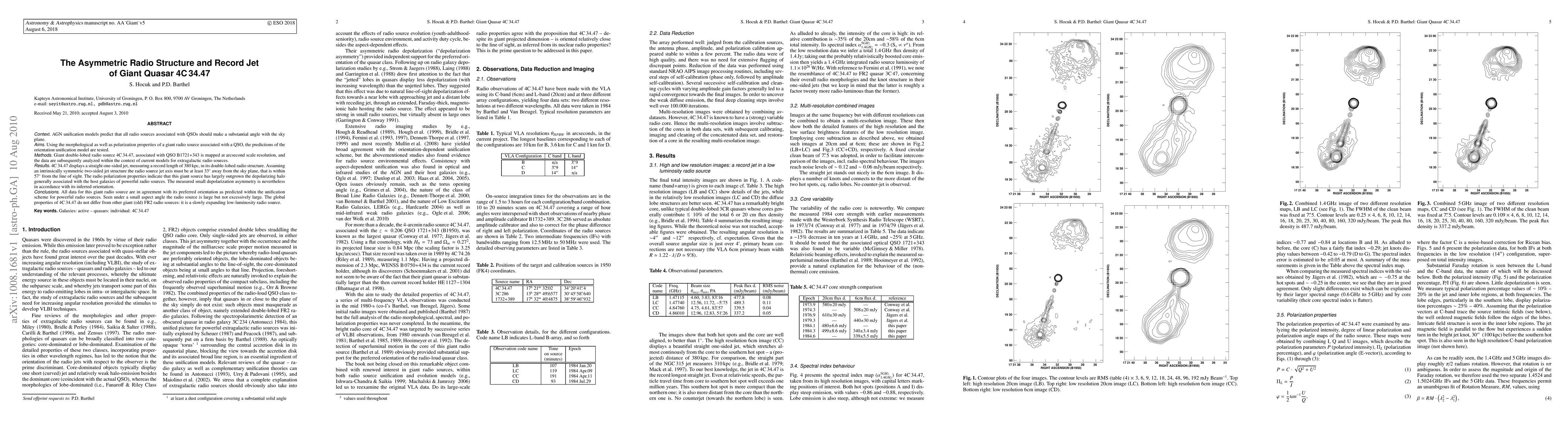 Giant double-lobed radio source 4C34.47 displays a straight one-sided jet, measuring a record length of 380kpc, in its double-lobed radio structure. Assuming an intrinsically symmetric two-sided jet structure the radio source jet axis must be at least 33 degrees away from the sky plane, that is within 57 degrees from the line of sight. The radio polarization properties indicate that this giant source has largely outgrown the depolarizing halo generally associated with the host galaxies of powerful radio sources. The measured small depolarization asymmetry is nevertheless in accordance with its inferred orientation. All data for this giant radio source are in agreement with its preferred orientation as predicted within the unification scheme for powerful radio sources. Seen under a small aspect angle the radio source is large but not excessively large. The global properties of 4C34.47 do not differ from other giant (old) FR2 radio sources: it is a slowly expanding low-luminosity radio source.