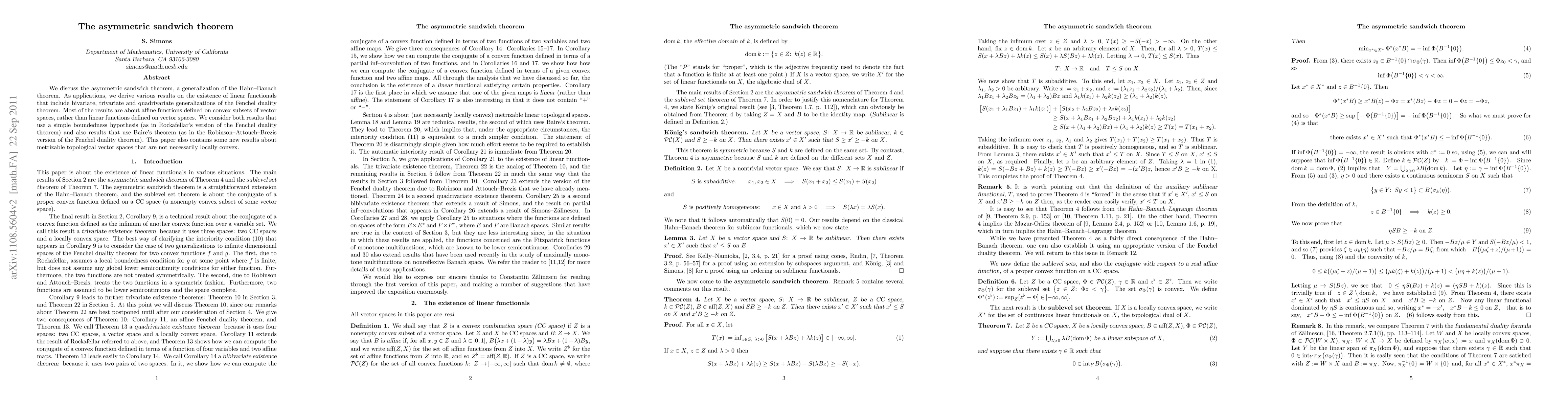 The asymmetric sandwich theorem generalizes the Hahn-Banach theorem, providing existence results for affine functions on convex subsets of vector spaces, with applications to various generalizations of the Fenchel duality theorem. The paper also introduces new findings regarding metrizable topological vector spaces that may not be locally convex.
