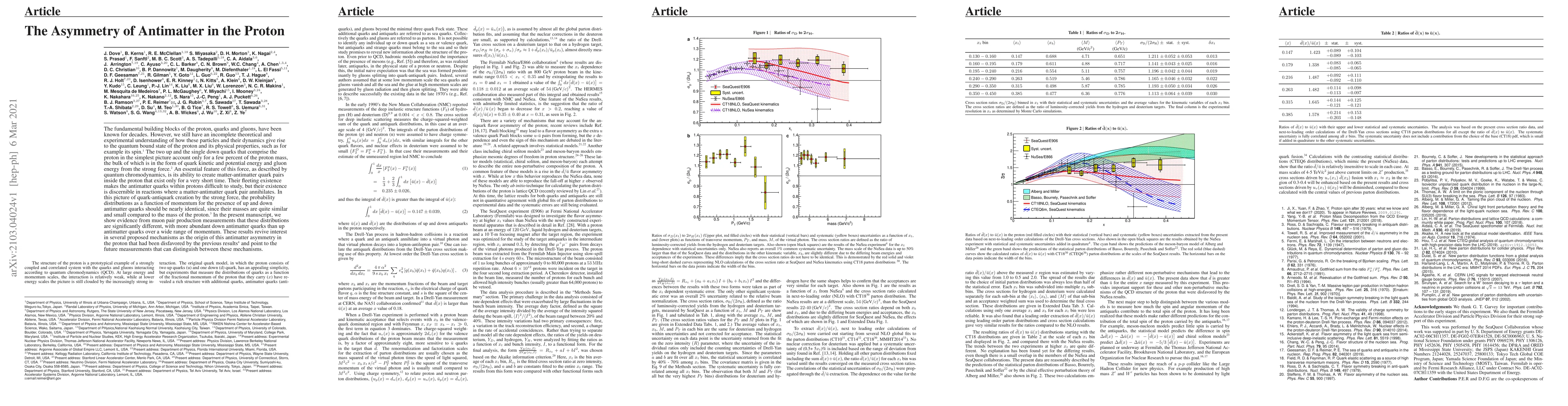This paper presents evidence from muon pair production measurements revealing a significant asymmetry in the distribution of antimatter quarks within protons, showing more abundant down antimatter quarks compared to up antimatter quarks. These findings challenge previous assumptions and revive interest in mechanisms explaining this asymmetry.