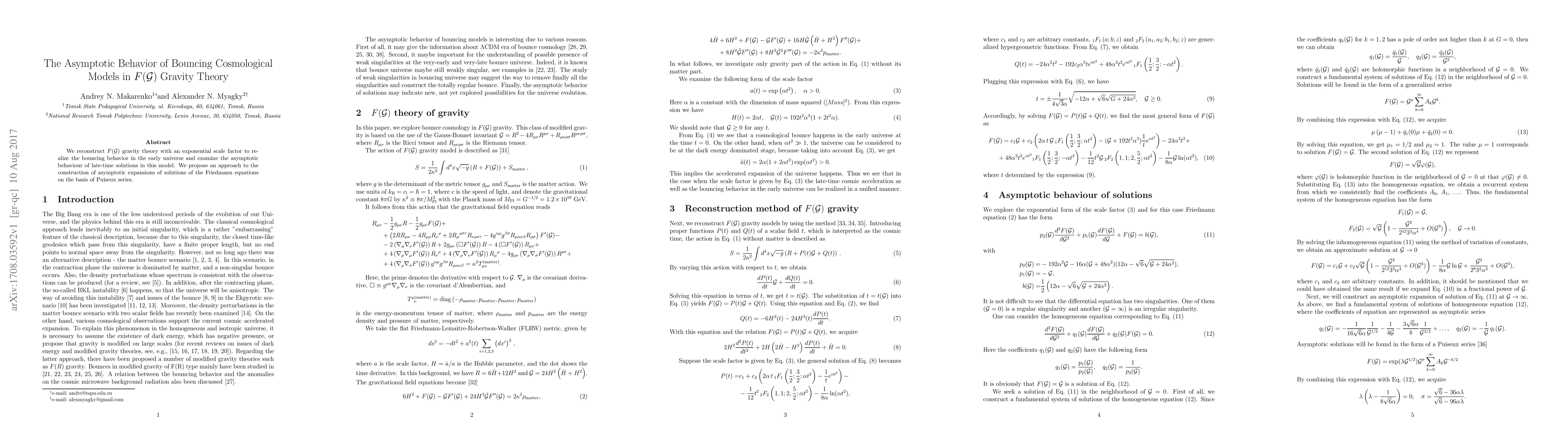 We reconstruct $F(\mathcal{G})$ gravity theory with an exponential scale factor to realize the bouncing behavior in the early universe and examine the asymptotic behaviour of late-time solutions in this model. We propose an approach to the construction of asymptotic expansions of solutions of the Friedmann equations on the basis of Puiseux series.