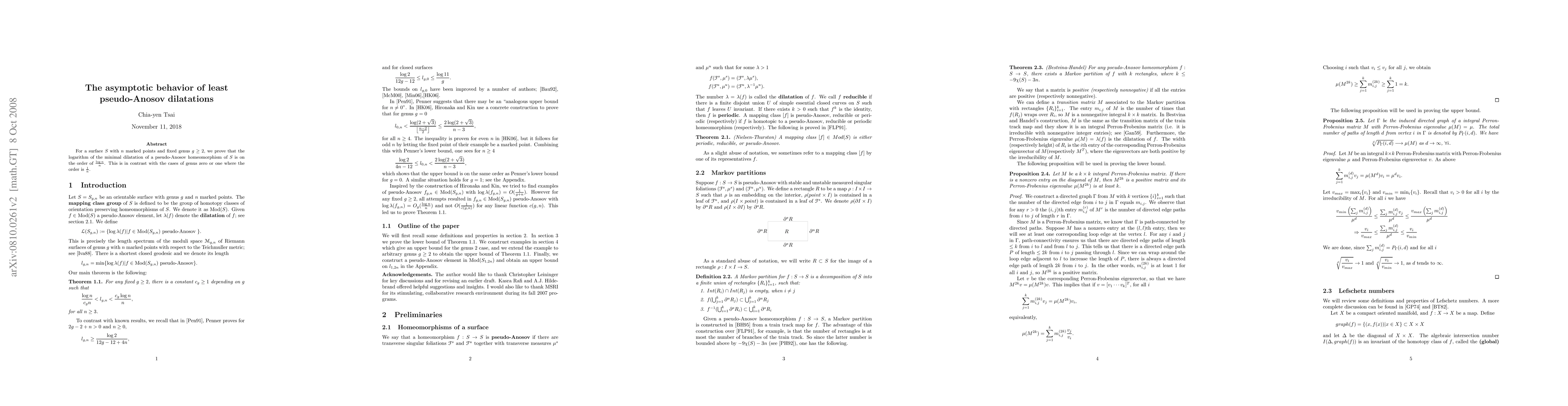Summary: This paper proves that for surfaces of fixed genus $g \geq 2$ with $n$ marked points, the logarithm of the minimal pseudo-Anosov dilatation scales as $(\log n)/n$, contrasting with the $1/n$ scaling observed for genus zero or one.