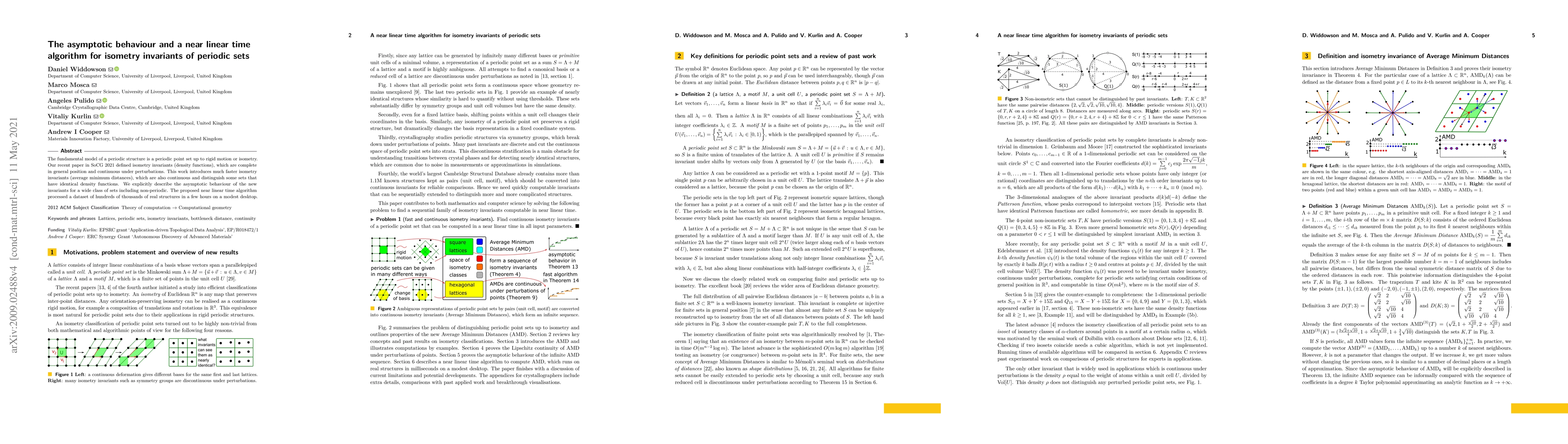 The fundamental model of a periodic structure is a periodic point set up to rigid motion or isometry. Our recent paper in SoCG 2021 defined isometry invariants (density functions), which are complete in general position and continuous under perturbations. This work introduces much faster isometry invariants (average minimum distances), which are also continuous and distinguish some sets that have identical density functions. We explicitly describe the asymptotic behaviour of the new invariants for a wide class of sets including non-periodic. The proposed near linear time algorithm processed a dataset of hundreds of thousands of real structures in a few hours on a modest desktop.