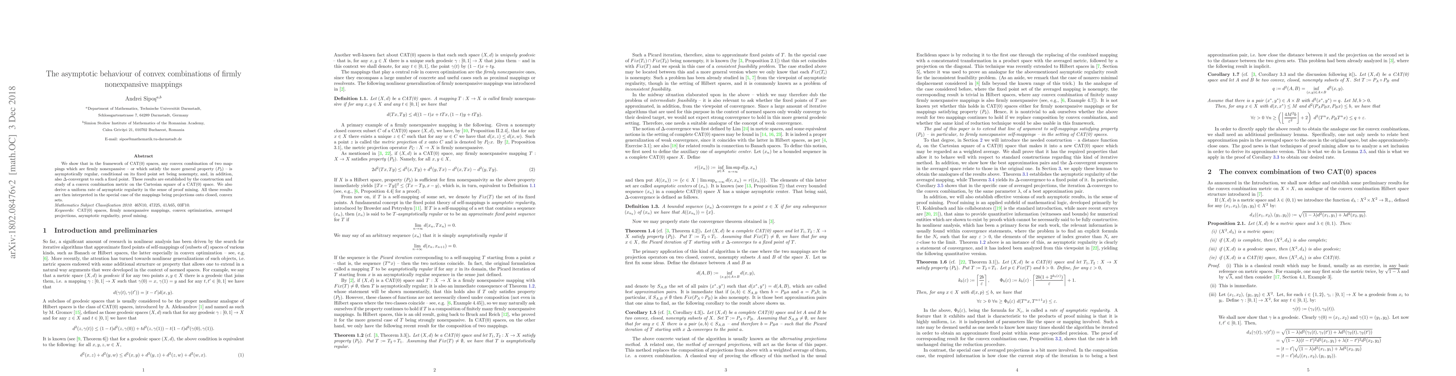 We show that in the framework of CAT(0) spaces, any convex combination of two mappings which are firmly nonexpansive -- or which satisfy the more general property $(P_2)$ -- is asymptotically regular, conditional on its fixed point set being nonempty, and, in addition, also $\Delta$-convergent to such a fixed point. These results are established by the construction and study of a convex combination metric on the Cartesian square of a CAT(0) space. We also derive a uniform rate of asymptotic regularity in the sense of proof mining. All these results are then interpreted in the special case of the mappings being projections onto closed, convex sets.