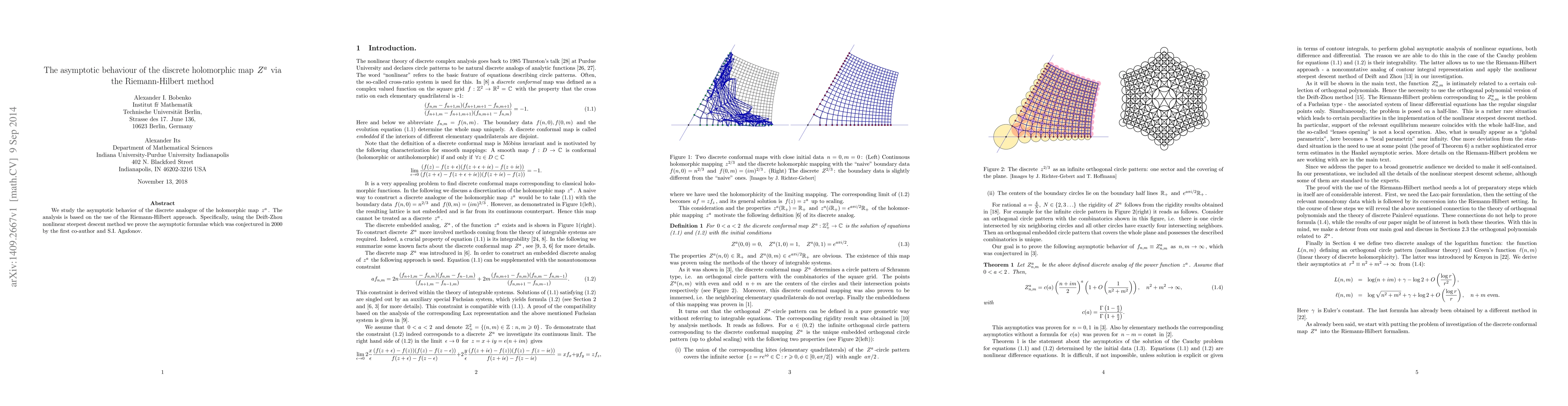 This research paper uses the Riemann-Hilbert method to study the asymptotic behavior of a discrete holomorphic map, proving conjectured formulae from 2000 in collaboration with S.I. Agafonov.