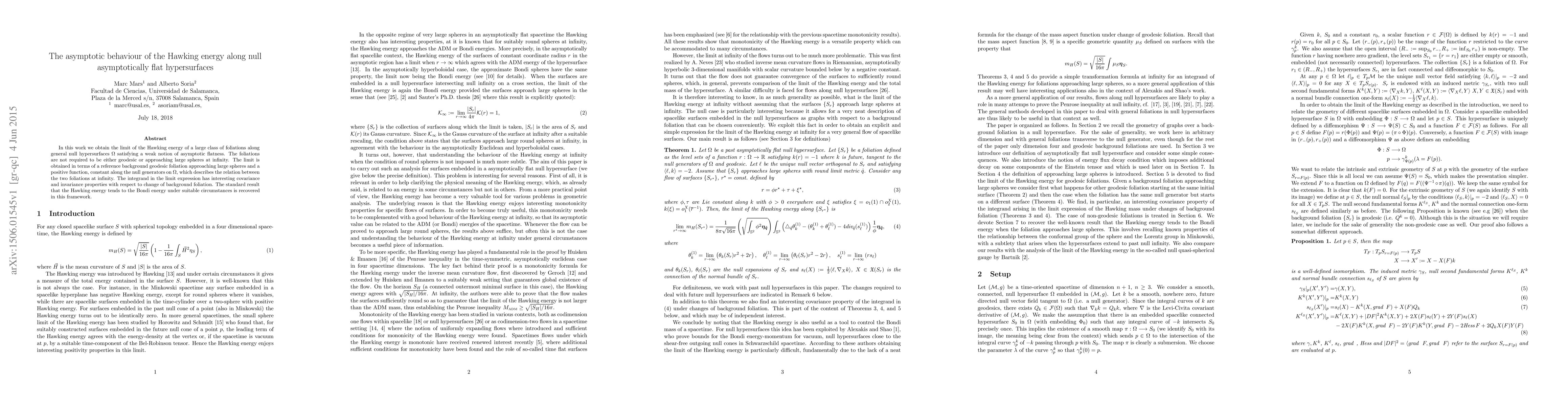 This paper investigates the asymptotic behavior of Hawking energy along null asymptotically flat hypersurfaces, deriving a limit expression in terms of a reference background geodesic foliation and a function describing the relation between foliations at infinity. The result recovers the standard Hawking-to-Bondi energy transition under suitable conditions.