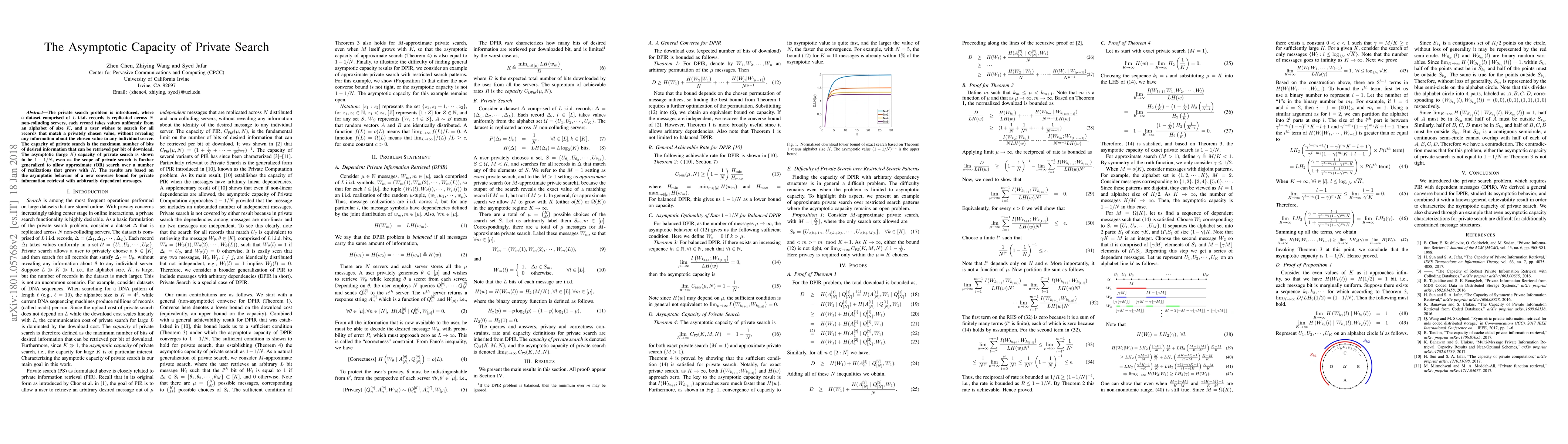 The private search problem is introduced, where a dataset comprised of $L$ i.i.d. records is replicated across $N$ non-colluding servers, each record takes values uniformly from an alphabet of size $K$, and a user wishes to search for all records that match a privately chosen value, without revealing any information about the chosen value to any individual server. The capacity of private search is the maximum number of bits of desired information that can be retrieved per bit of download. The asymptotic (large $K$) capacity of private search is shown to be $1-1/N$, even as the scope of private search is further generalized to allow approximate (OR) search over a number of realizations that grows with $K$. The results are based on the asymptotic behavior of a new converse bound for private information retrieval with arbitrarily dependent messages.