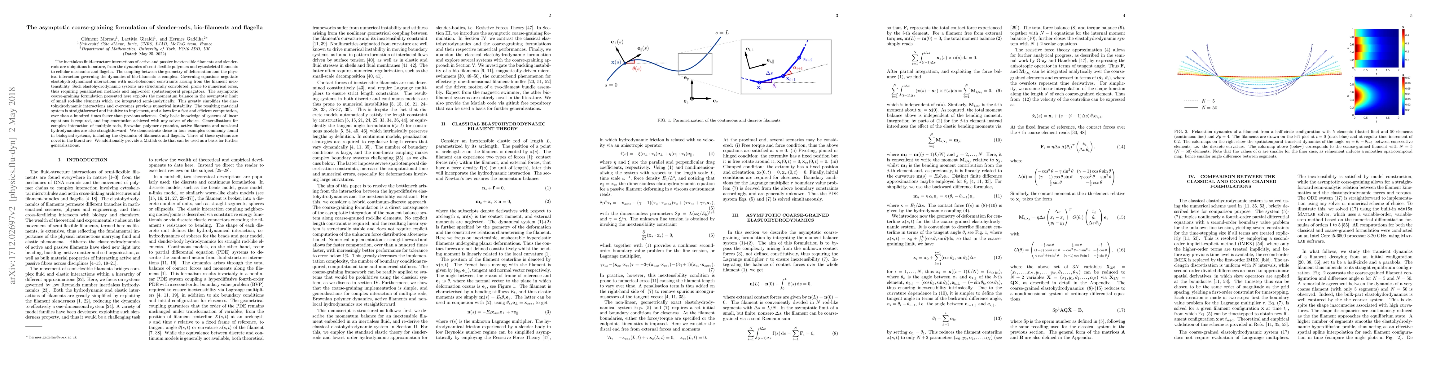 The inertialess fluid-structure interactions of active and passive inextensible filaments and slender- rods are ubiquitous in nature, from the dynamics of semi-flexible polymers and cytoskeletal filaments to cellular mechanics and flagella. The coupling between the geometry of deformation and the phys- ical interaction governing the dynamics of bio-filaments is complex. Governing equations negotiate elastohydrodynamical interactions with non-holonomic constraints arising from the filament inex- tensibility. Such elastohydrodynamic systems are structurally convoluted, prone to numerical erros, thus requiring penalization methods and high-order spatiotemporal propagators. The asymptotic coarse-graining formulation presented here exploits the momentum balance in the asymptotic limit of small rod-like elements which are integrated semi-analytically. This greatly simplifies the elas- tohydrodynamic interactions and overcomes previous numerical instability. The resulting matricial system is straightforward and intuitive to implement, and allows for a fast and efficient computation, over than a hundred times faster than previous schemes. Only basic knowledge of systems of linear equations is required, and implementation achieved with any solver of choice. Generalisations for complex interaction of multiple rods, Brownian polymer dynamics, active filaments and non-local hydrodynamics are also straightforward. We demonstrate these in four examples commonly found in biological systems, including the dynamics of filaments and flagella. Three of these systems are novel in the literature. We additionally provide a Matlab code that can be used as a basis for further generalisations.