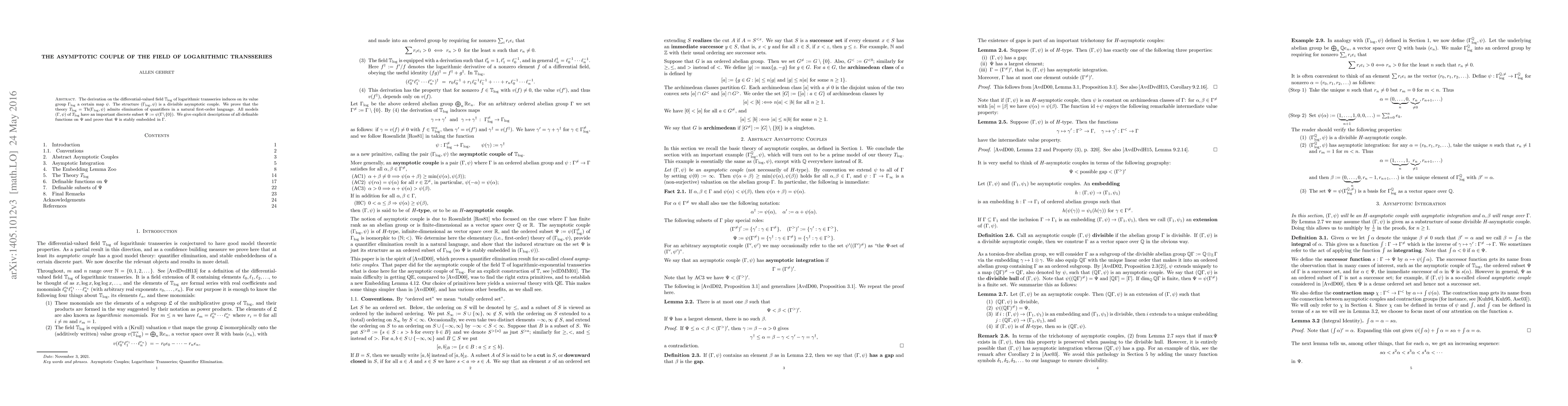 The derivation on the differential-valued field $\mathbb{T}_{\log}$ of logarithmic transseries induces on its value group $\Gamma_{\log}$ a certain map $\psi$. The structure $(\Gamma_{\log},\psi)$ is a divisible asymptotic couple. We prove that the theory $T_{\log} = {\rm Th}(\Gamma_{\log},\psi)$ admits elimination of quantifiers in a natural first-order language. All models $(\Gamma,\psi)$ of $T_{\log}$ have an important discrete subset $\Psi:=\psi(\Gamma\setminus\{0\})$. We give explicit descriptions of all definable functions on $\Psi$ and prove that $\Psi$ is stably embedded in $\Gamma$.