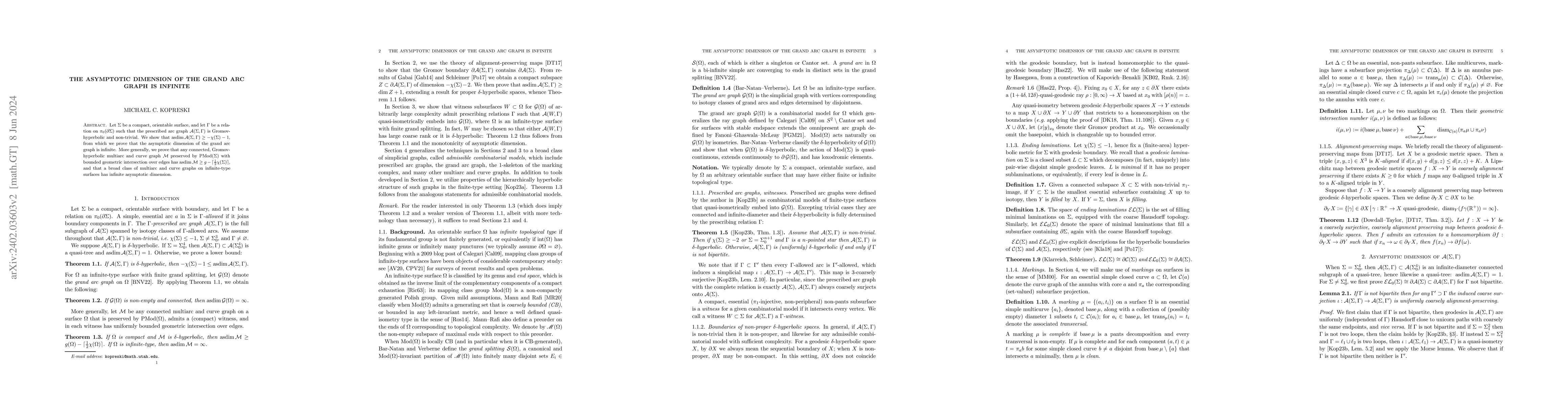 This paper proves that the asymptotic dimension of the grand arc graph on a compact, orientable surface is infinite, showing $\text{asdim } \mathcal{A}(\Sigma,\Gamma) \geq -\chi(\Sigma) - 1$. It further establishes that any connected, Gromov-hyperbolic multiarc and curve graph preserved by $\text{PMod}(\Sigma)$ with bounded edge intersections has an asymptotic dimension of at least $g - \lceil\frac{1}{2} \chi(\Sigma)\rceil$.