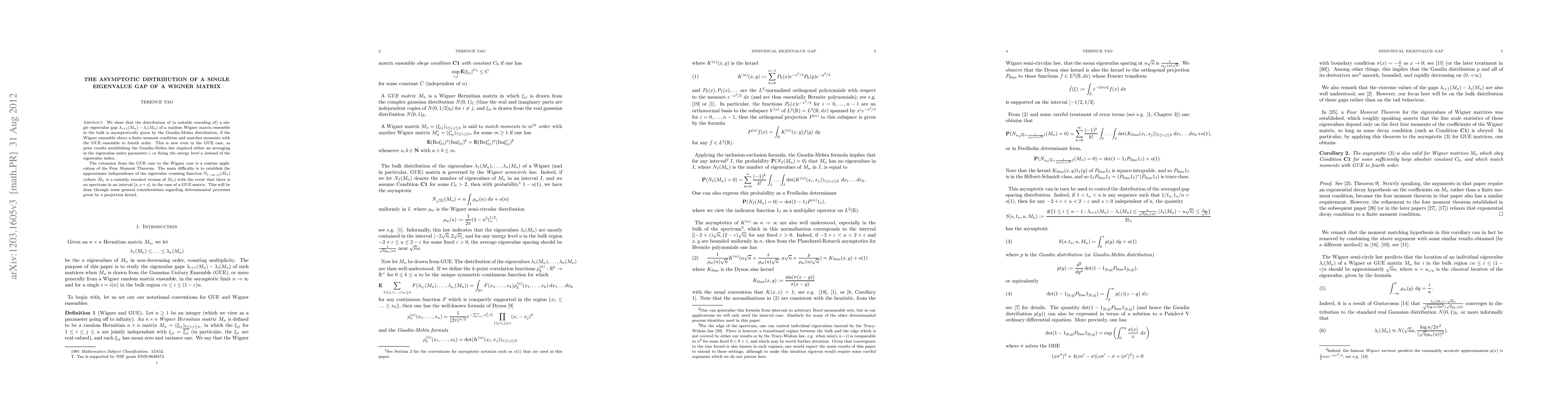 We show that the distribution of (a suitable rescaling of) a single eigenvalue gap $\lambda_{i+1}(M_n)-\lambda_i(M_n)$ of a random Wigner matrix ensemble in the bulk is asymptotically given by the Gaudin-Mehta distribution, if the Wigner ensemble obeys a finite moment condition and matches moments with the GUE ensemble to fourth order. This is new even in the GUE case, as prior results establishing the Gaudin-Mehta law required either an averaging in the eigenvalue index parameter $i$, or fixing the energy level $u$ instead of the eigenvalue index. The extension from the GUE case to the Wigner case is a routine application of the Four Moment Theorem. The main difficulty is to establish the approximate independence of the eigenvalue counting function $N_{(-\infty,x)}(\tilde M_n)$ (where $\tilde M_n$ is a suitably rescaled version of $M_n$) with the event that there is no spectrum in an interval $[x,x+s]$, in the case of a GUE matrix. This will be done through some general considerations regarding determinantal processes given by a projection kernel.